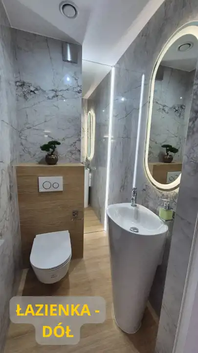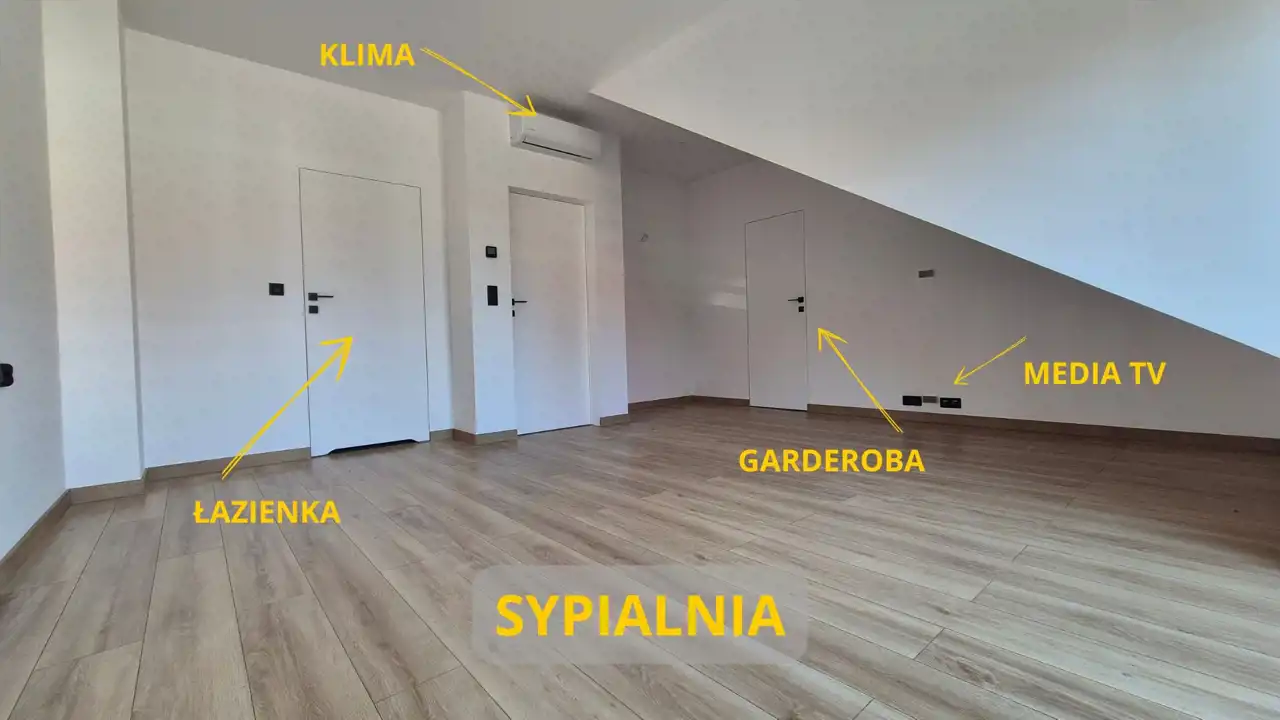 Na piętrze 3 duże sypialnie, druga łazienka oraz łazienka znajdująca się w sypialni.