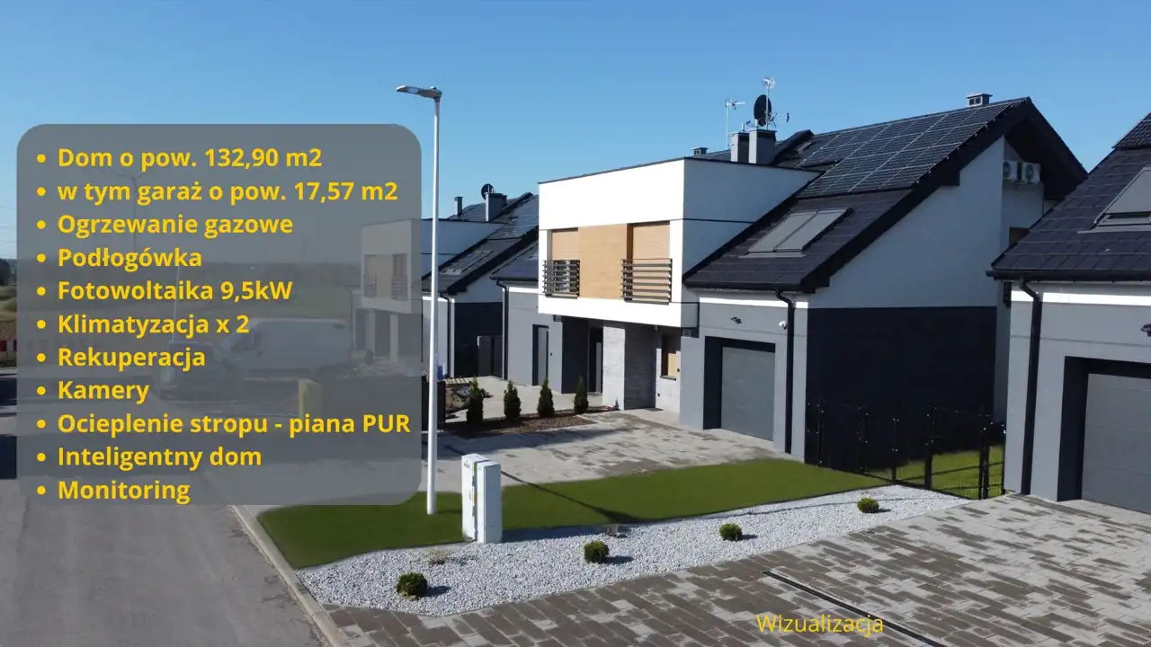 Dom został oddany do użytkowania w 2023r. Jest całkowicie wykończony i umeblowany. Dom składa się z dwóch kondygnacji. Powierzchnia użytkowa to 132,90m2 w tym garaż o pow. 17,57m2.