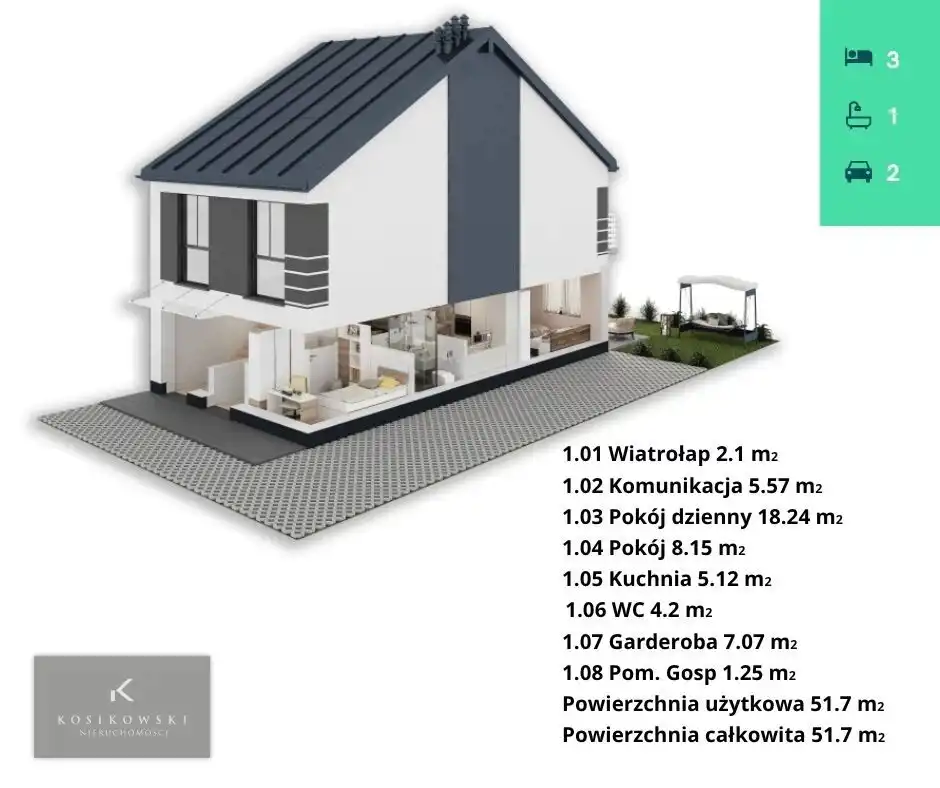 • salon • kuchnia • 2 sypialnie • łazienka • ogród