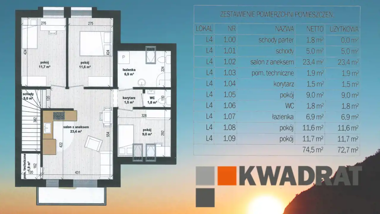 - Charakterystyka mieszkania 74.6 m2, 4 pokoje