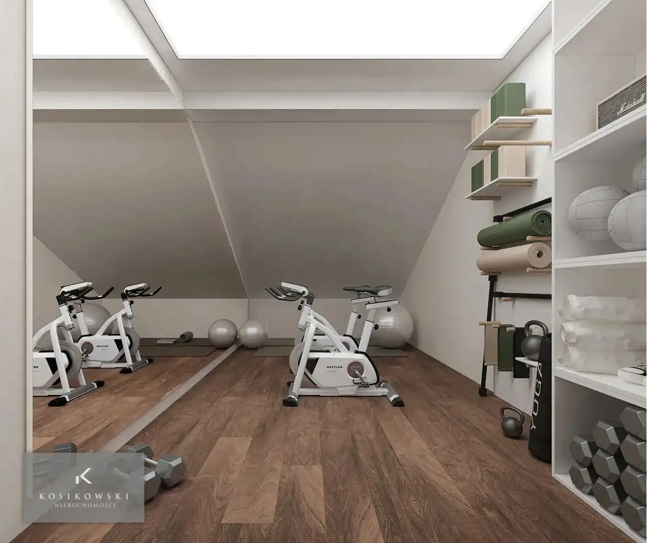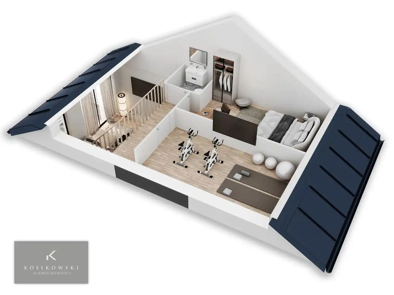 • salon z aneksem kuchennym • balkon • 2 sypialnie • łazienka • antresola