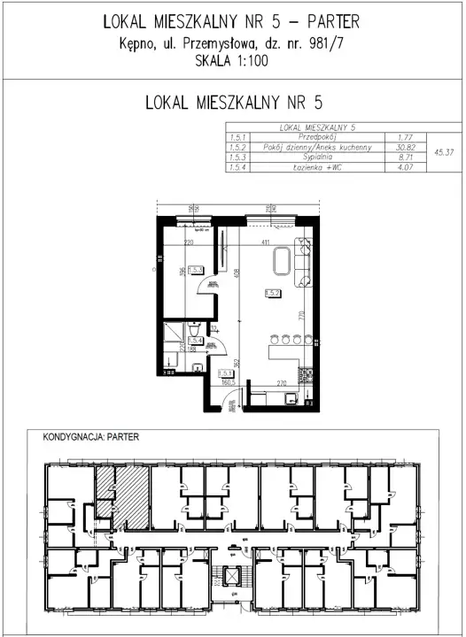Prezentowany lokal położony jest na parterze budynku. Powierzchnia wynosi 45,37 m². Mieszkanie posiada ustawny salon wraz z aneksem kuchennym, sypialnię, łazienkę oraz przedpokój. Z salonu mamy wyjście na duży balkon.