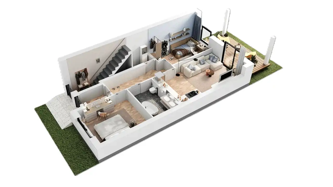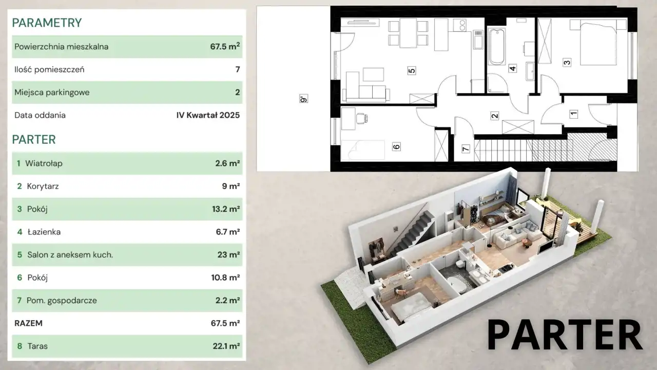 - 67,50 m2 (parter – ogród, salon z aneksem kuchennym i dwie sypialnie)
