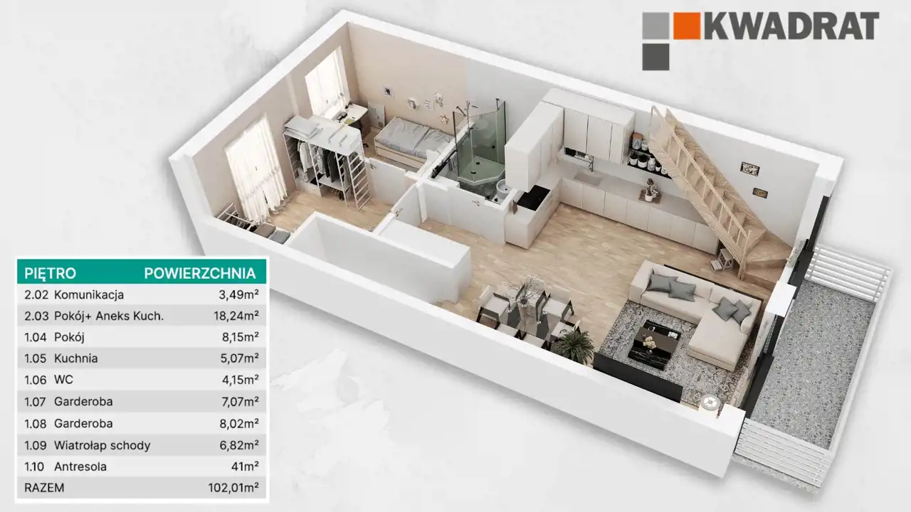 - 102,01 m2 (piętro + ANTRESOLA – balkon, salon z aneksem kuchennym, sypialnie i 2 łazienki) – pow. liczona po podłodze.