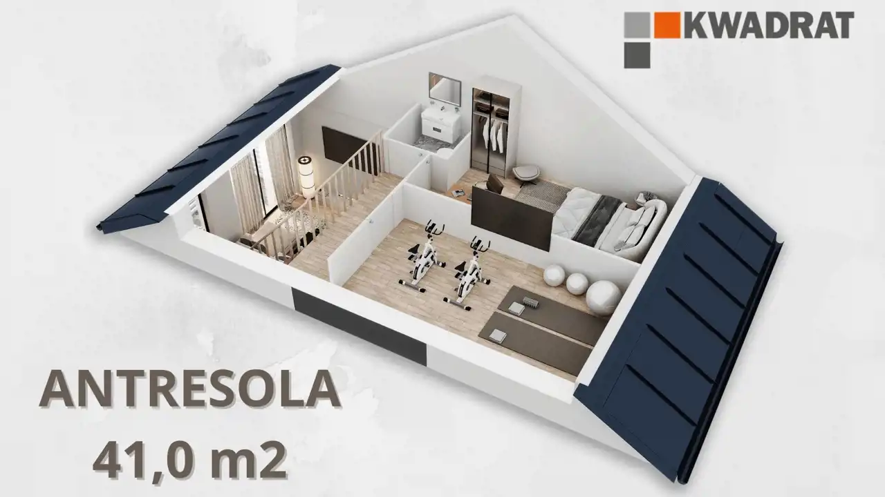 ANTRESOLA – to dodatkowa przestrzeń o pow. 41m2, którą można indywidualnie dostosować do potrzeb Klienta. Standardowo mieszczą się tam dwie sypialnie oraz łazienka.