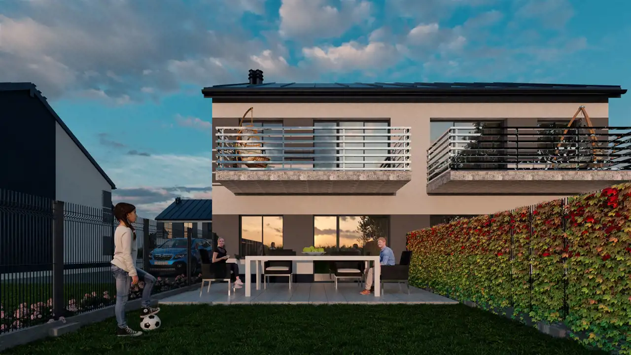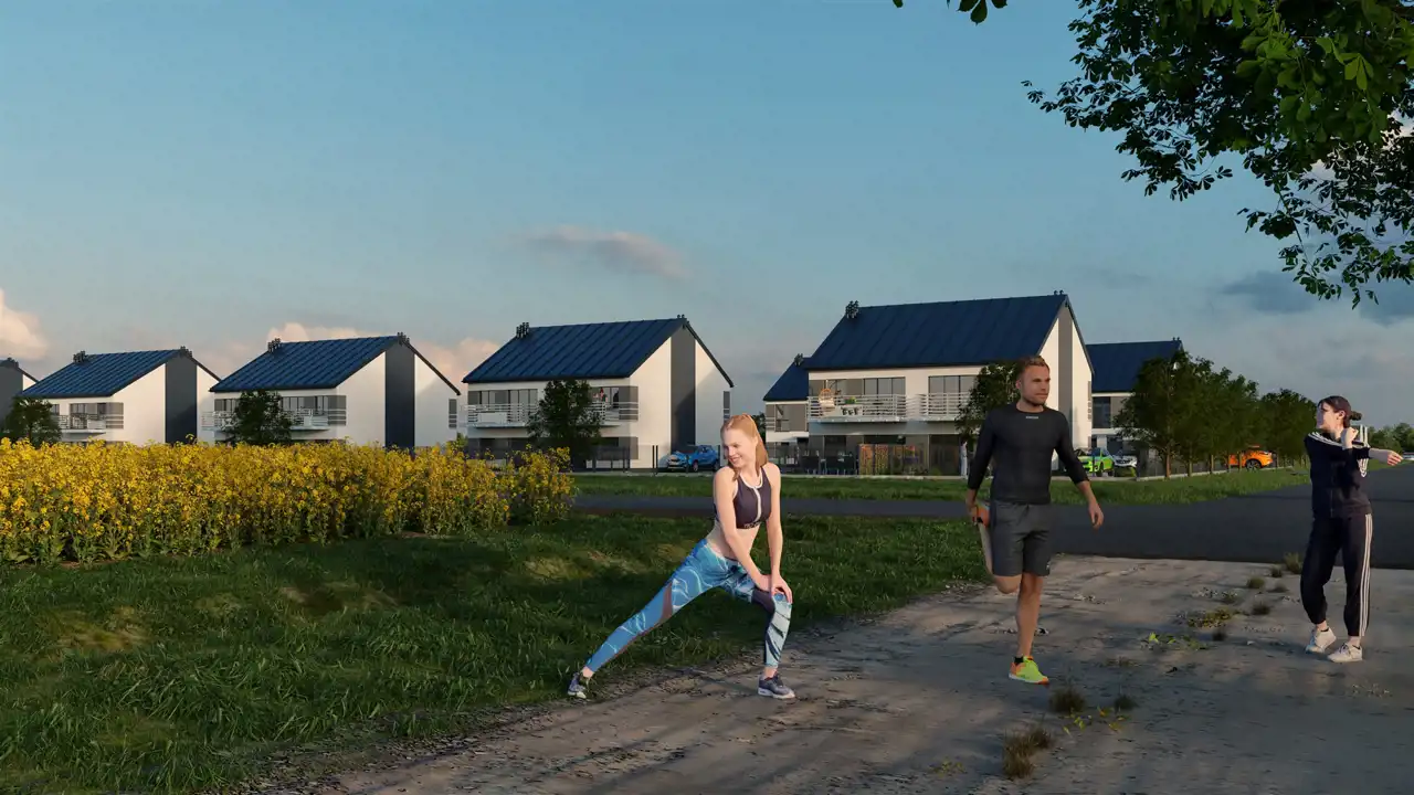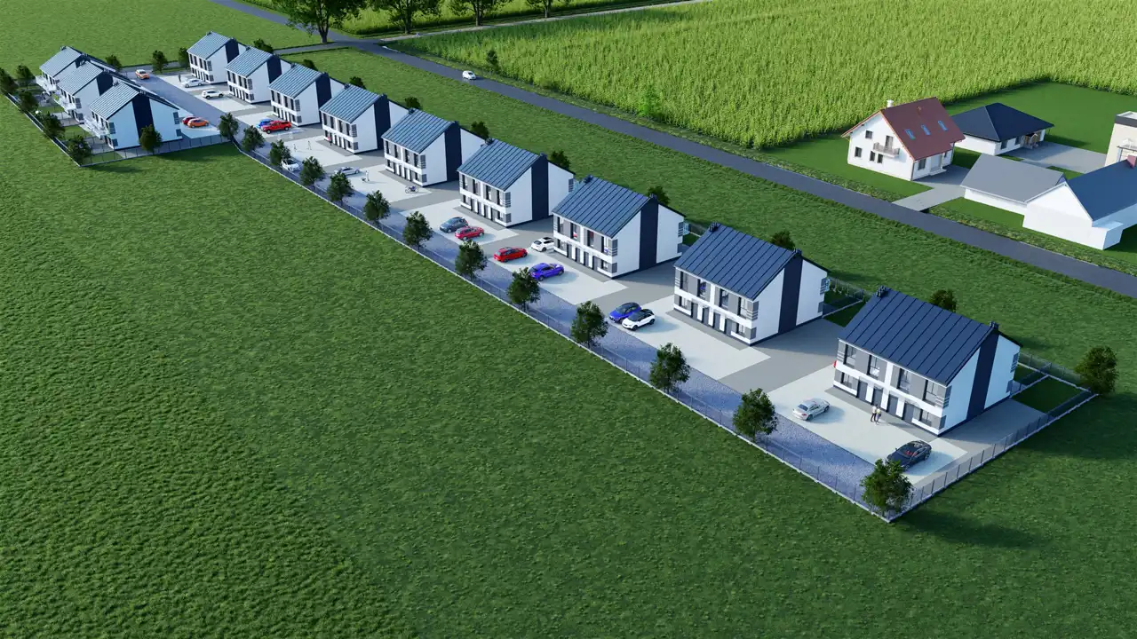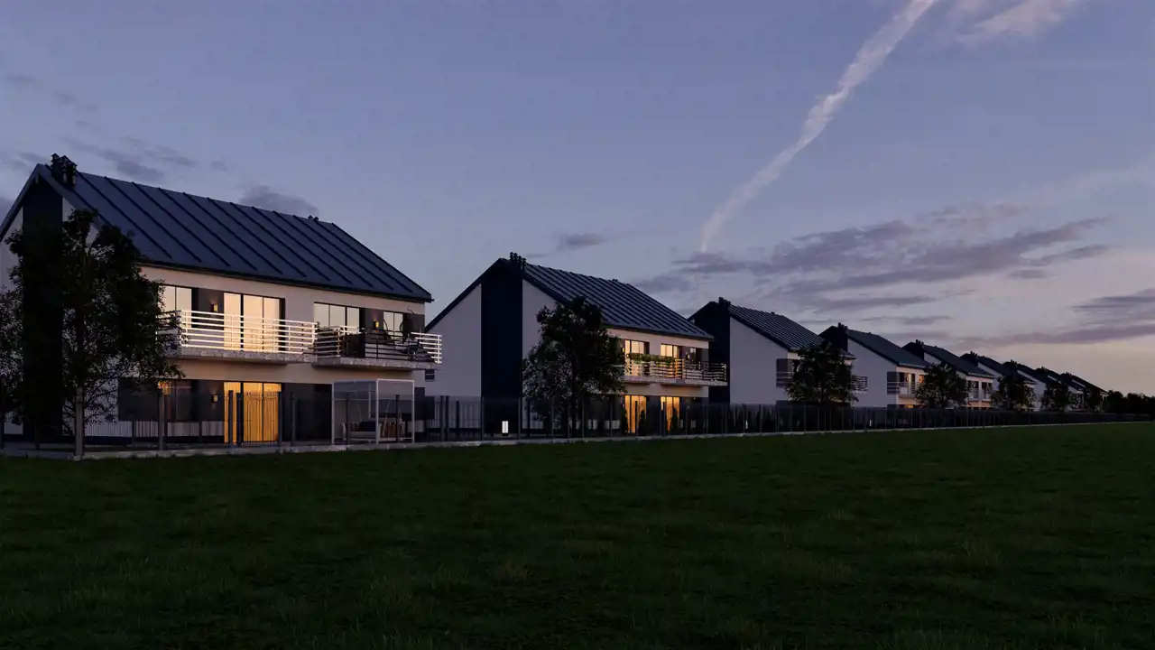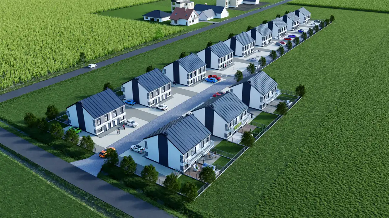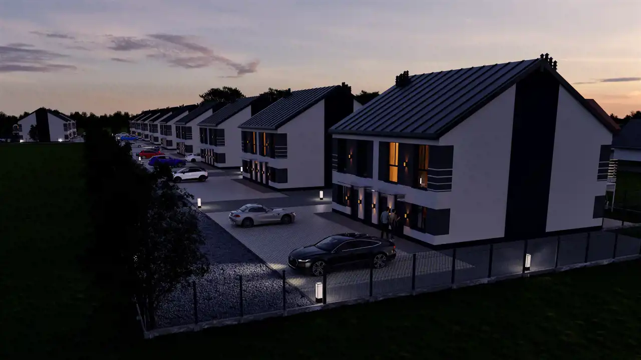 Nowoczesna forma budynków doskonale harmonizuje z funkcjonalnością wnętrz, co czyni tę inwestycję wyjątkową. Zewnętrzny wygląd budynków jest elegancki i minimalistyczny, z zastosowaniem wysokiej jakości materiałów, które nie tylko przyciągają wzrok, ale również zapewniają trwałość i odporność na warunki atmosferyczne. Prosta, a zarazem elegancka architektura sprawia, że budynki doskonale wkomponowują się w okoliczny krajobraz, tworząc spójną całość z otoczeniem.