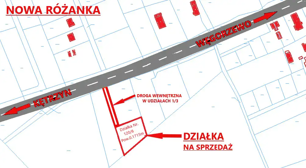 Na sprzedaż działka budowlana nr 120/6 o pow. 1715 m wraz z udziałem 1/3 oraz wydanymi WZ na 2 domy jednorodzinne w drodze Nr.120/3 w Nowej Różance oddalona o 70m od drogi krajowej Kętrzyn -Węgorzewo - prąd - woda -eko szambo cena- 89.000zł