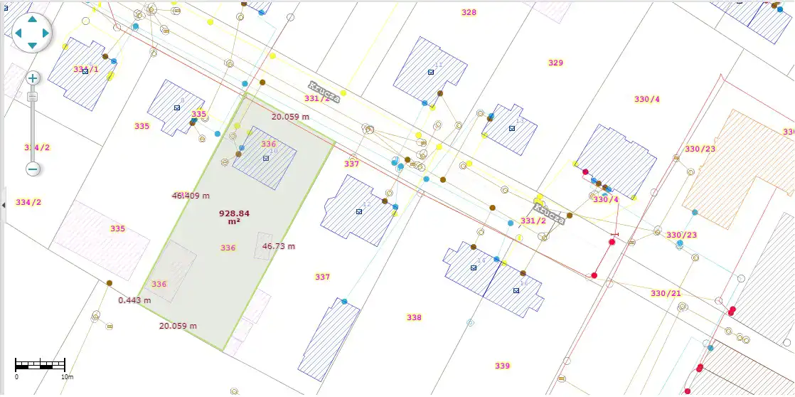 Wymiary działki: 20 (front) x 46,75 [m]. Na działce znajdują się dwa wolnostojące garaże.
