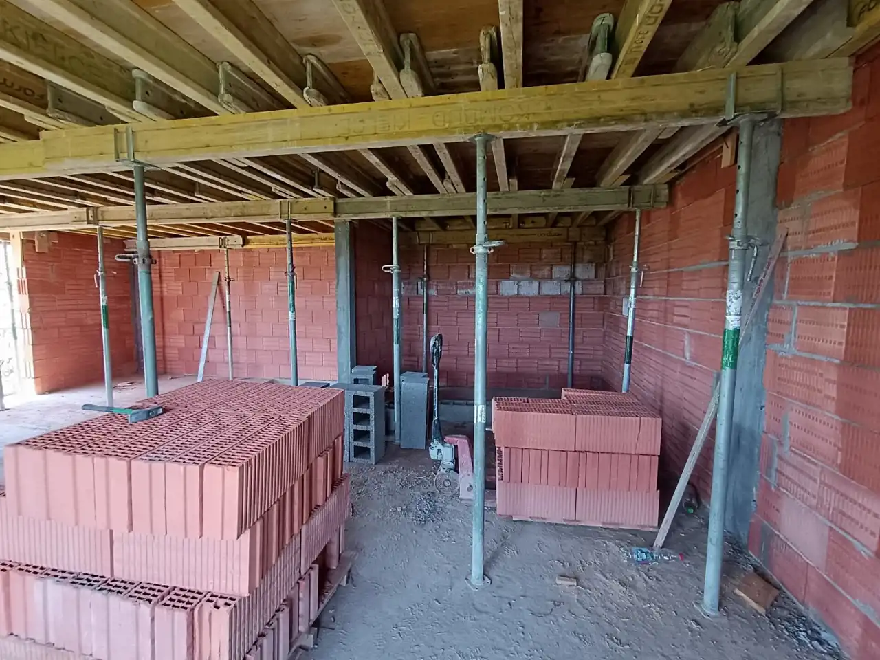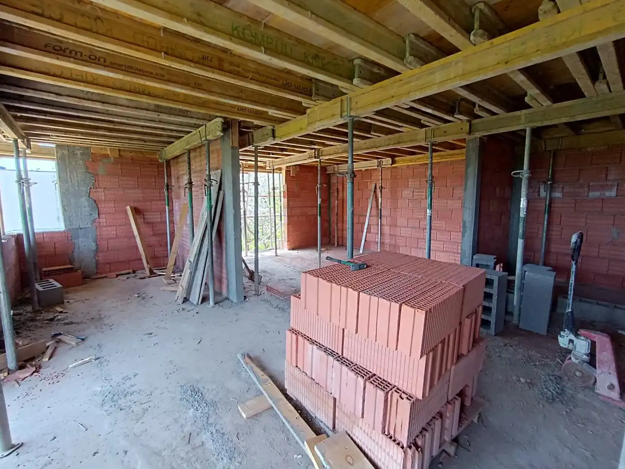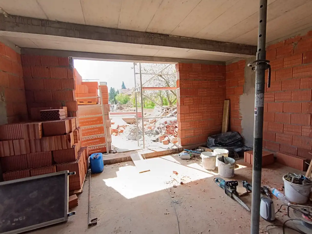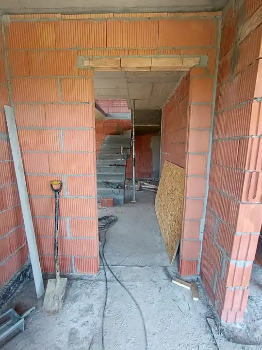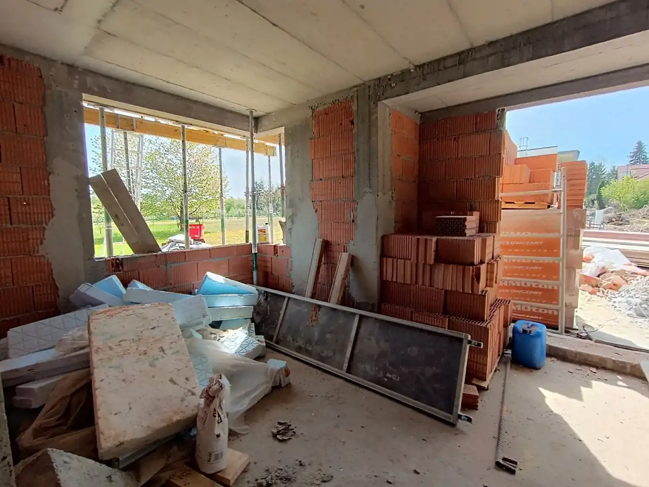 Ściany zewnętrzne oraz wewnętrze wybudowane z pustaka ceramicznego, docieplone styropianem. Dach kryty blachą.