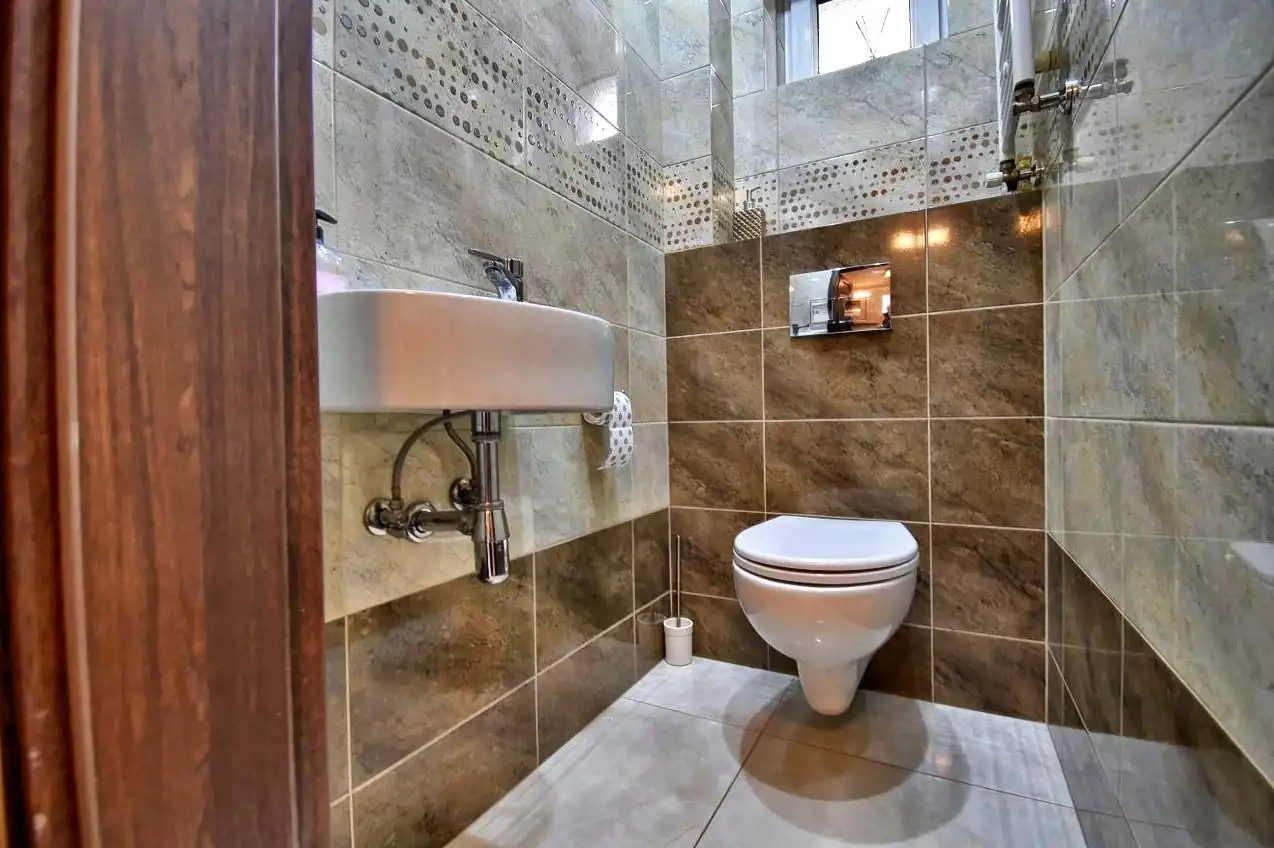 - dwa osobne, niezależne pokoje z aneksami kuchennymi i łazienkami, z osobnymi wejściami. Pierwsza sypialnia o pow. 38,4 m2 z WC o pow. 6,45 m2) oraz balkonem o pow. 1,6 m2. Druga sypialnia o pow. 32 m2 z WC o pow. ok. 5,8 m2, pom. gospodarczym o pow. ok. 8 m2.
