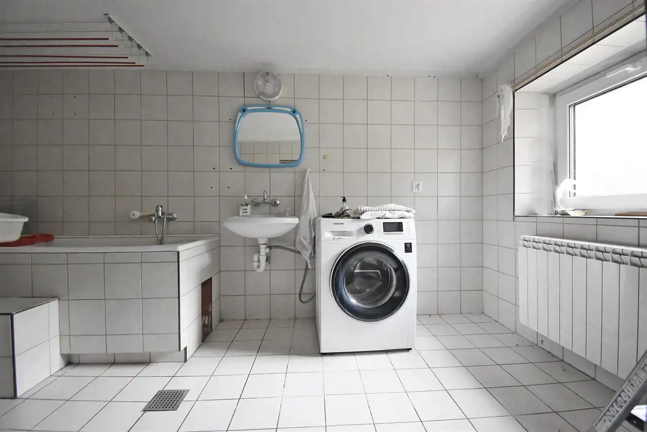 basement/ground floor: bathroom/laundry room, 2 rooms, garage for 2 cars, utility room.