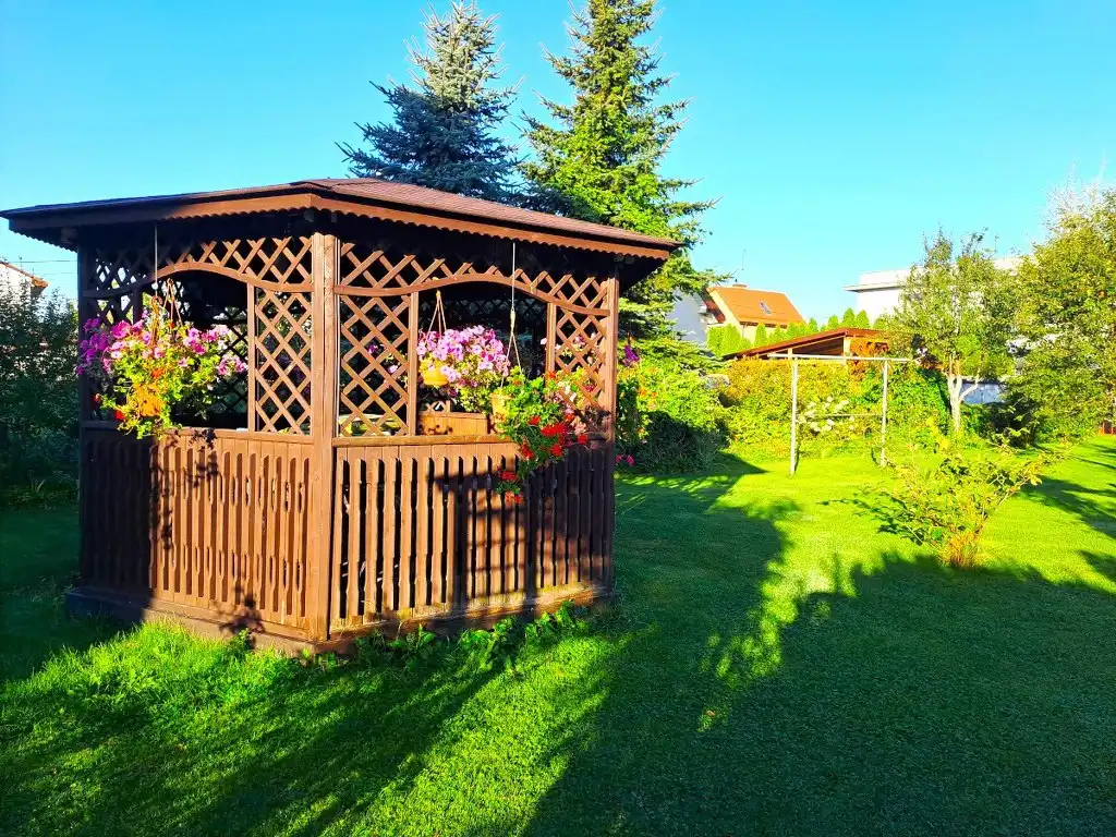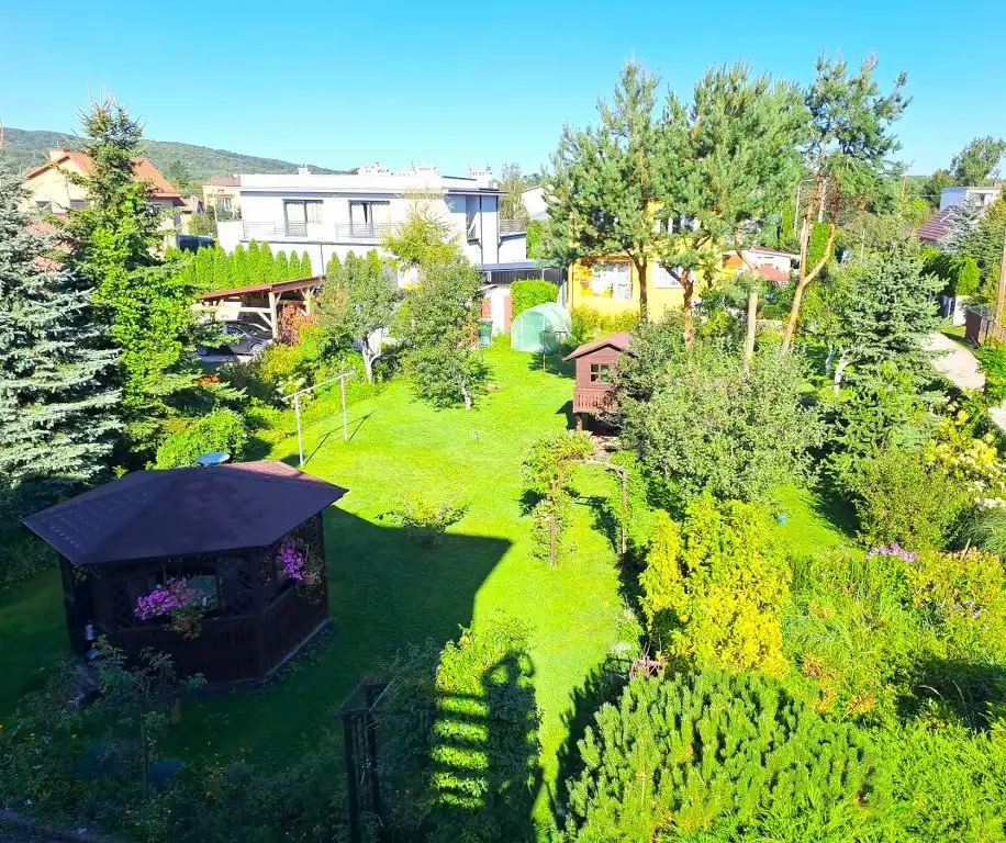 Teren wokół domu zagospodarowany. Na działce znajduje się kostka, trawnik ze zraszaczami do podlegania, krzewami oraz drzewami, altana, huśtawka oraz domek dla dzieci.