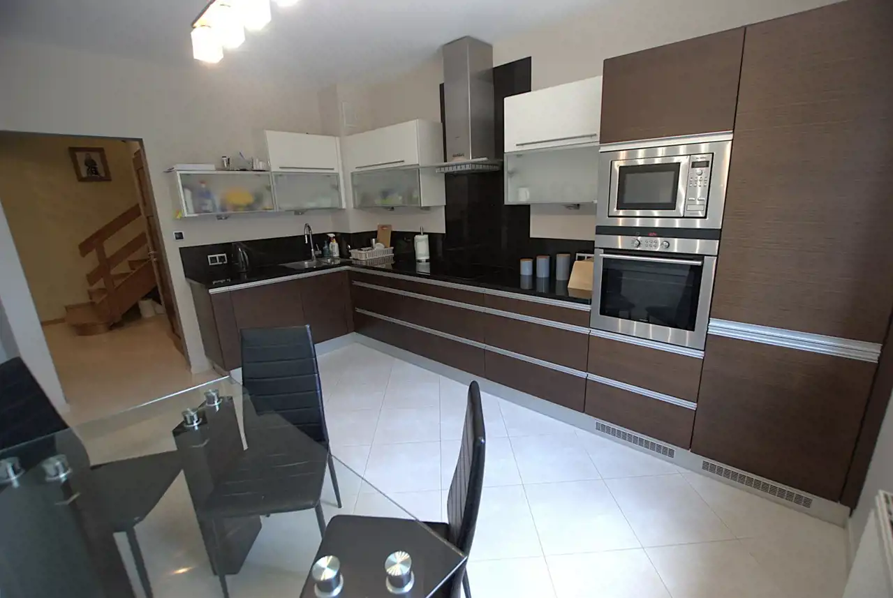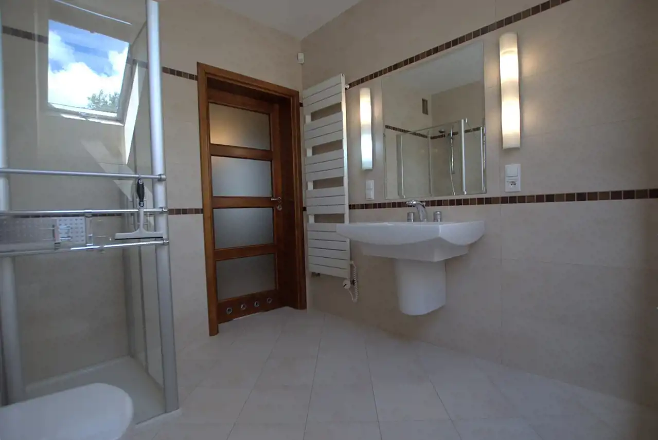 Dom bardzo zadbany wykończony bardzo dobrej jakości materiałami. Na podłogach w pokojach drewniany parkiet, okna plastikowe w dobrym stanie. Dom widny, słoneczny z ekspozycją okien na północny-wchód oraz południowy-zachód. Ogrzewanie ekonomicznym piecem dwufunkcyjny wymienionym 5 lat temu. Do budynku doprowadzenie wszystkie media: prąd, woda, kanalizacja oraz gaz. Cały dom bardzo zadbany, mało użytkowany (spełniał rolę 2 domu na wakacyjne przyjazdy do Polski).