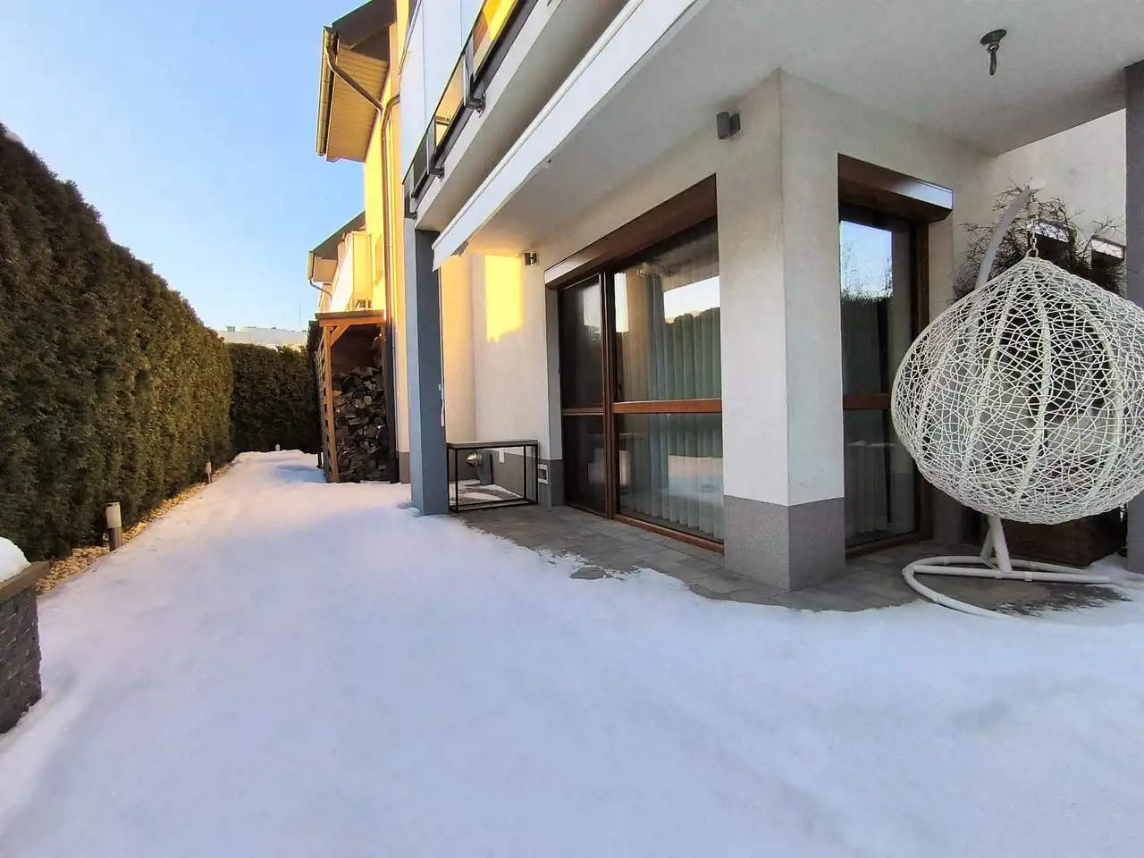 Brama garażowa stalowa, segmentowa, ocieplana, z napędem HORMANN. Balustrady balkonowe ze stali nierdzewnej. Parapety zewnętrzne z blachy stalowej powlekanej. Na tarasie antypoślizgowy, mrozoodporny gres.
