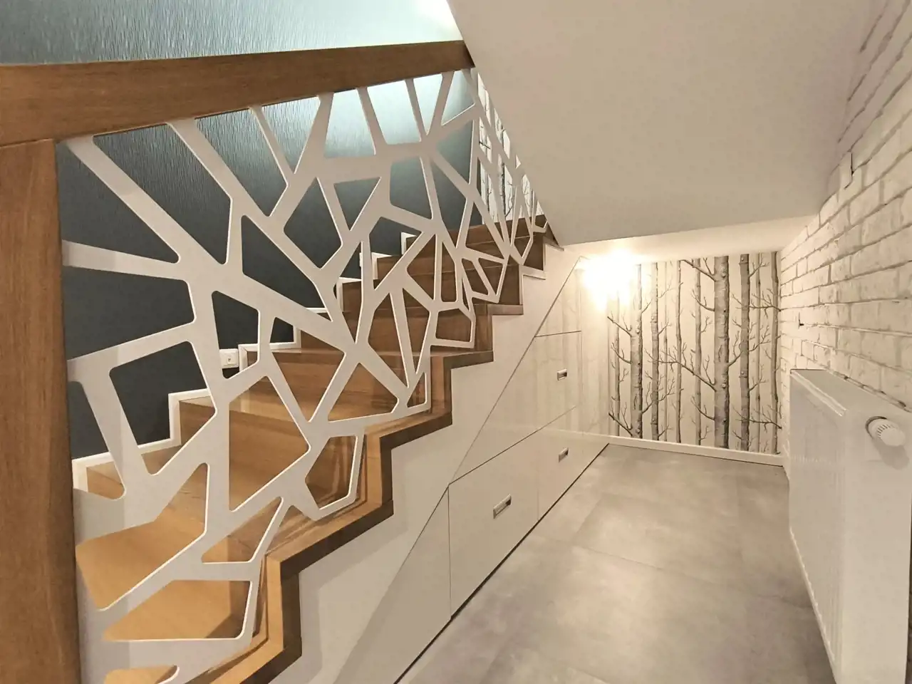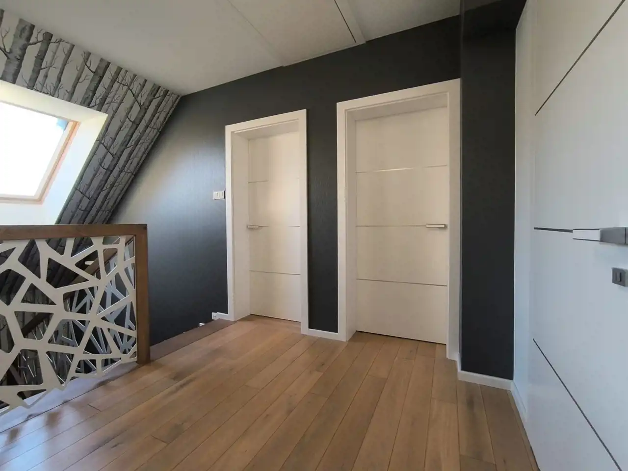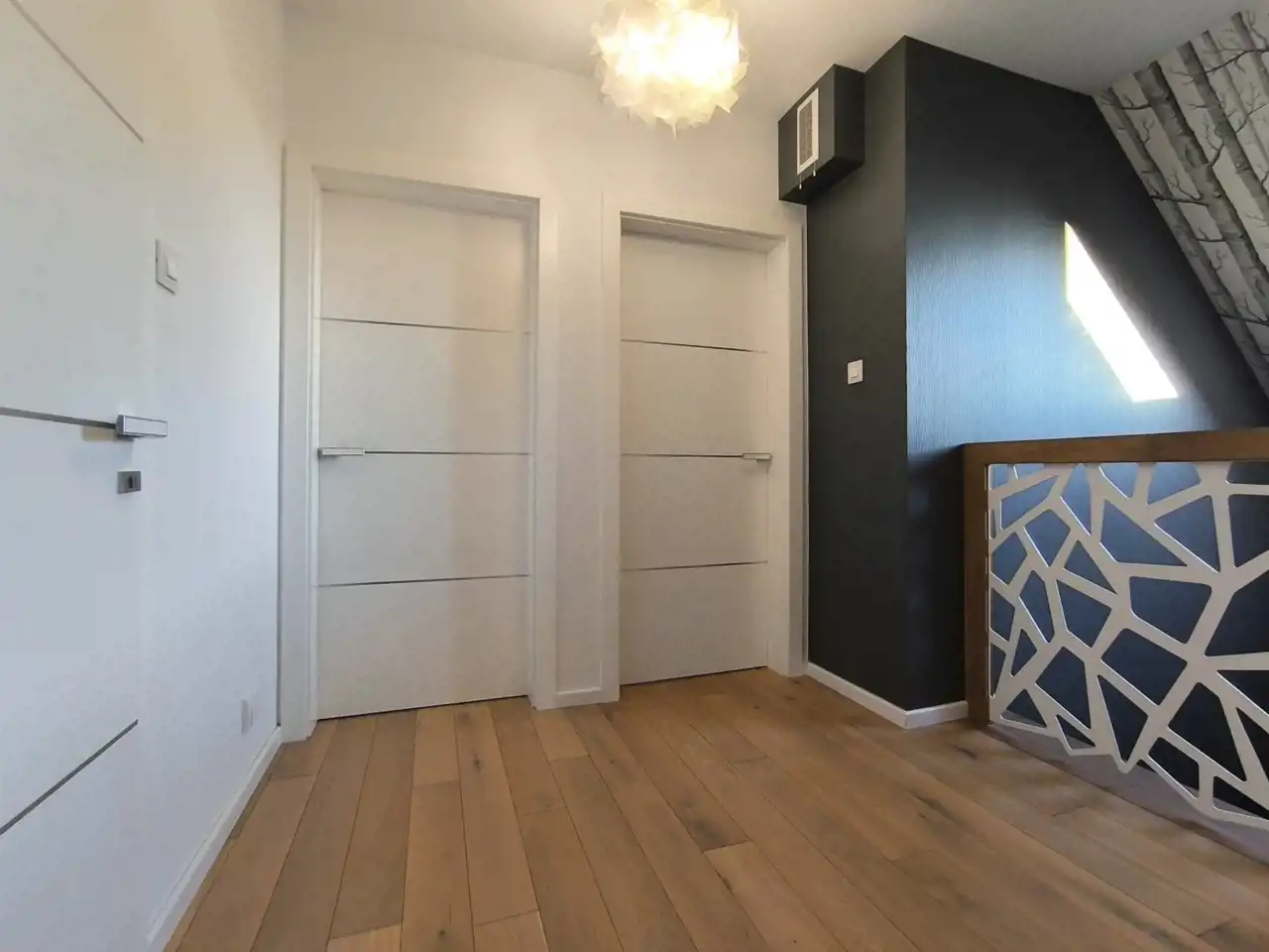 Do wykończenia użyto wyłącznie materiałów wysokiej jakości. Drzwi wewnętrzne robione na zamówienie przez firmę JAG-DOR; oświetlenie wyłącznie ledowe, kontakty AVE; podłogi MADERAS - dąb bielony. Ponadto w domu zamontowany odkurzacz centralny oraz zmiękczacz wody. Podłączony został również internet światłowodowy.
