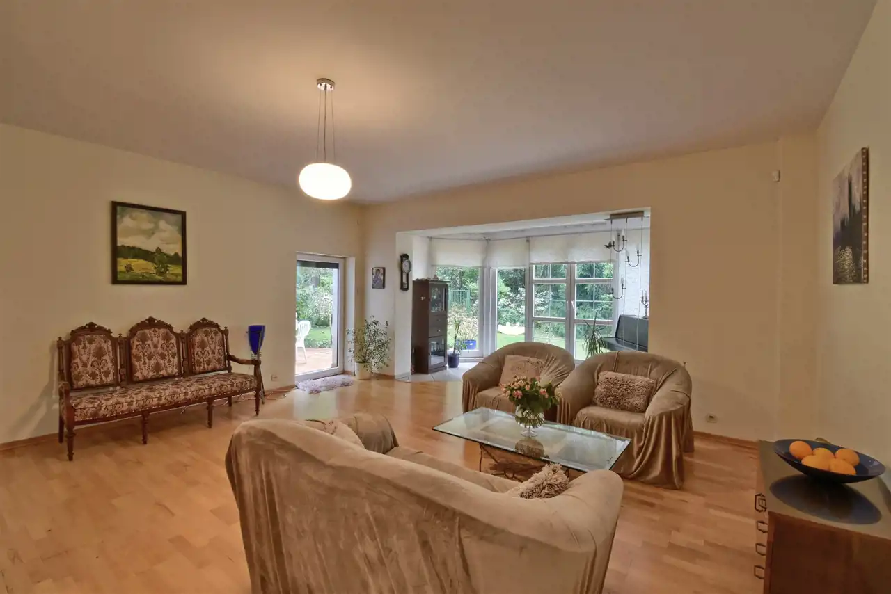 Na podłogach w pokojach i korytarzach - parkiet, w łazienkach, kuchni i piwnicy - gresy. Stolarka okienna drewniana w dobrym stanie. Zamontowano rolety antywłamaniowe.