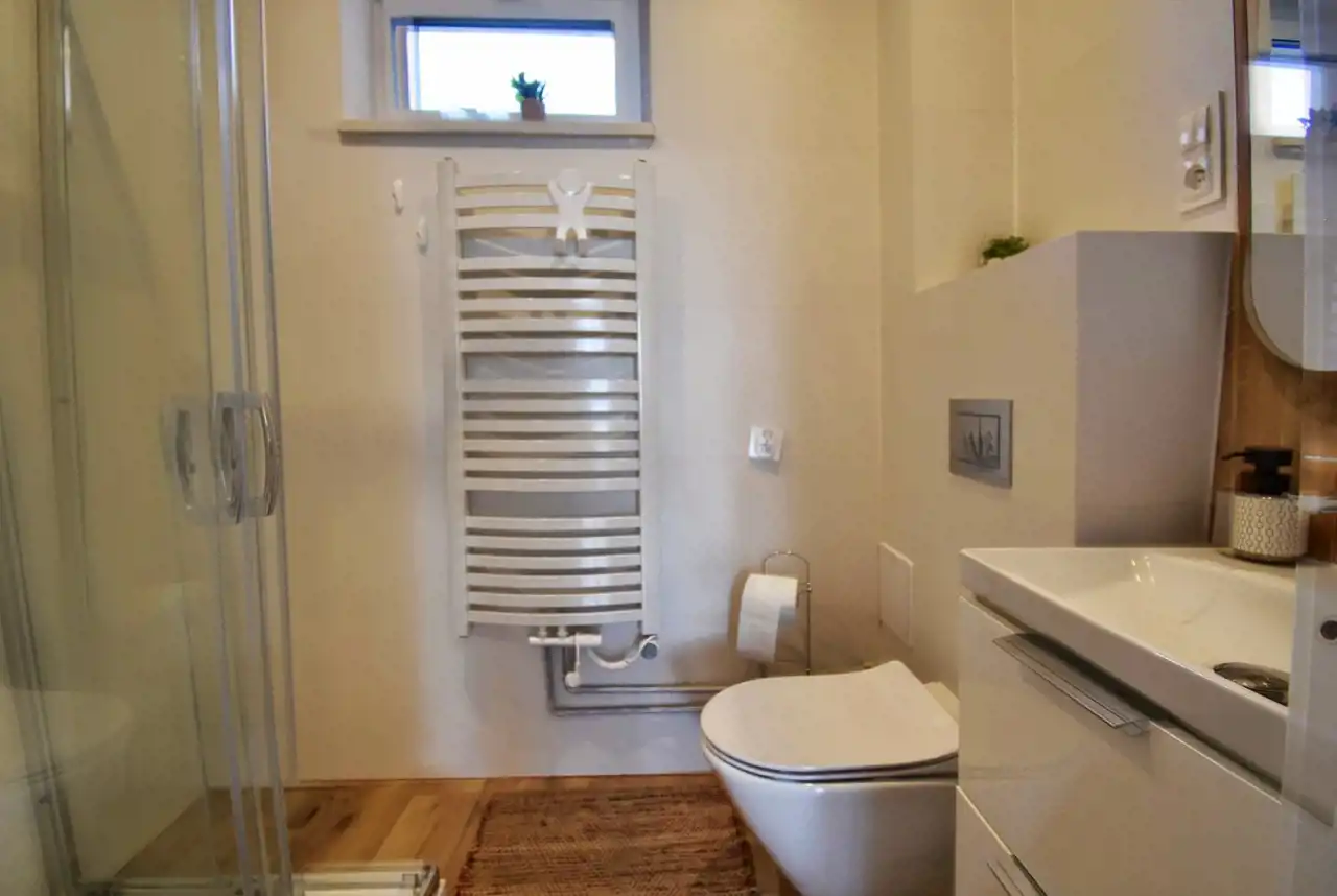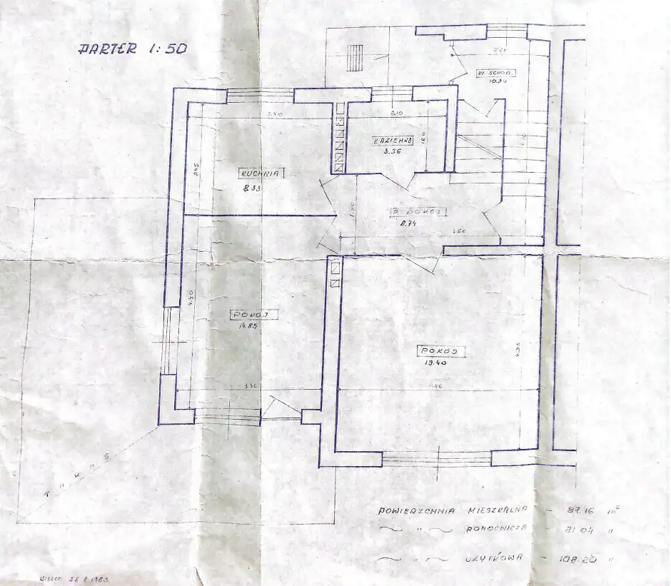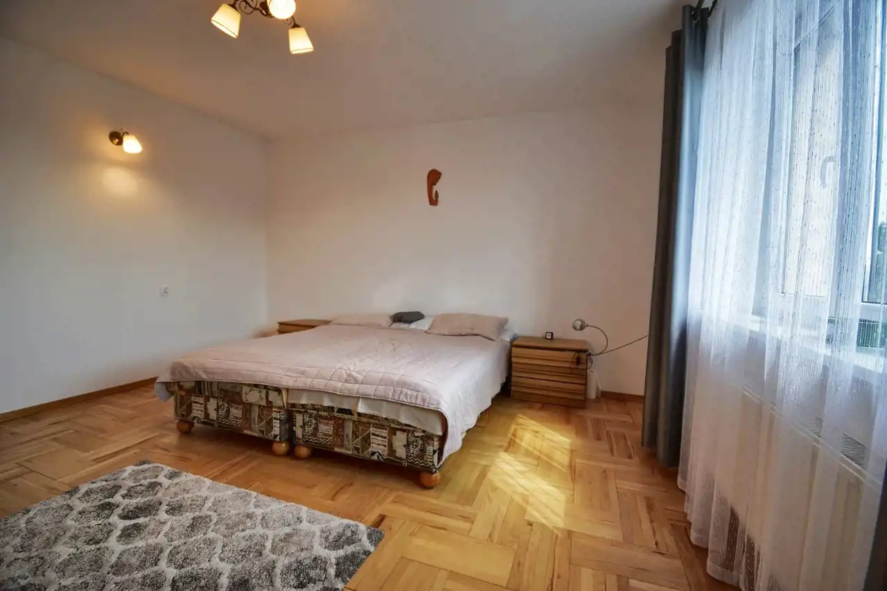 The house was built between 1979 and 1983 using traditional (masonry) technology. Double exterior walls (aerated concrete + brick), insulated with 10 cm of polystyrene, and finished with textured plaster. Modern triple-glazed PVC windows have been installed.