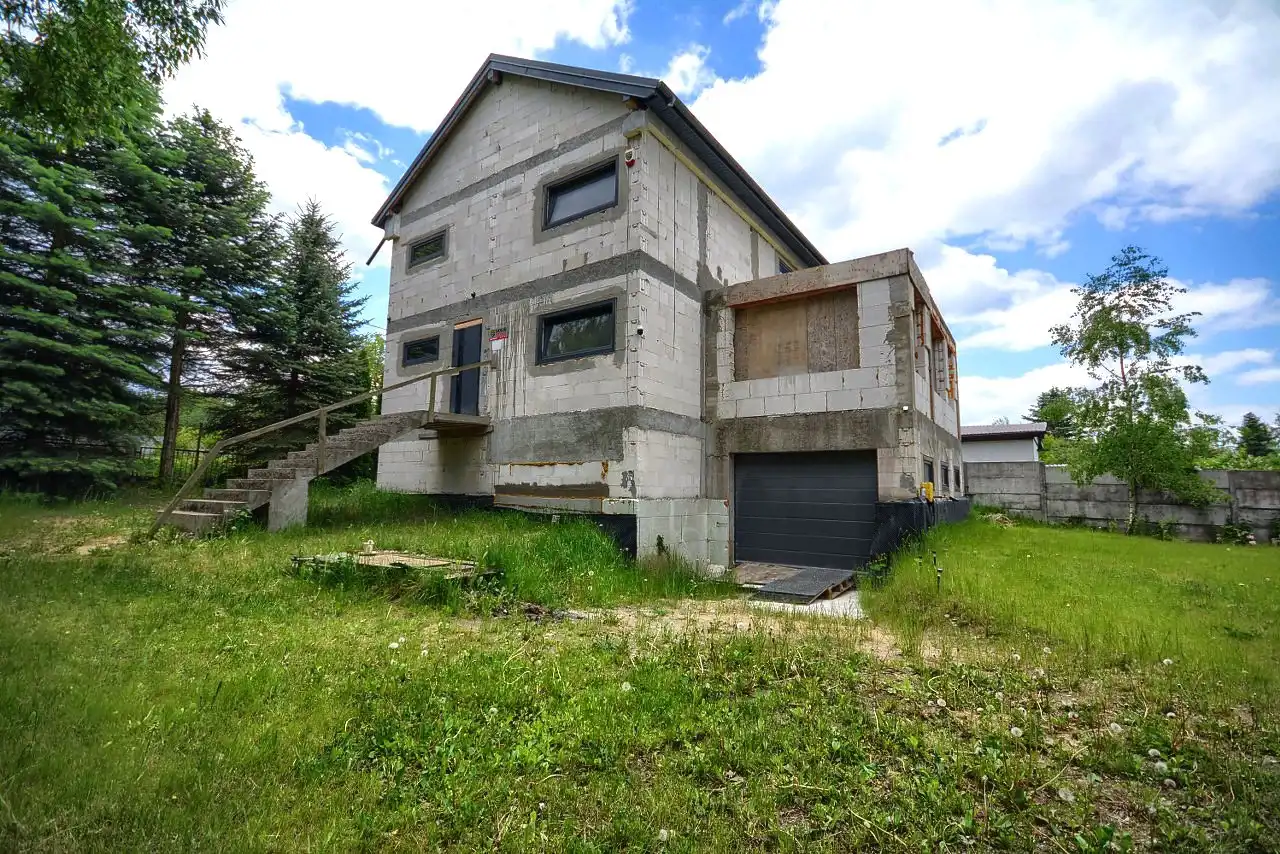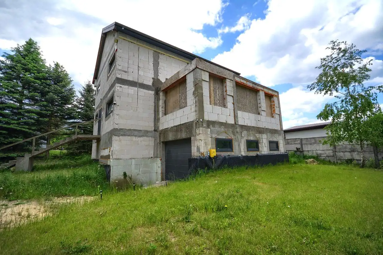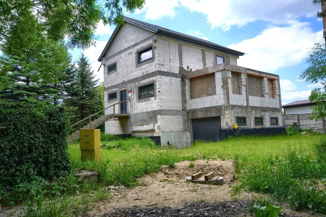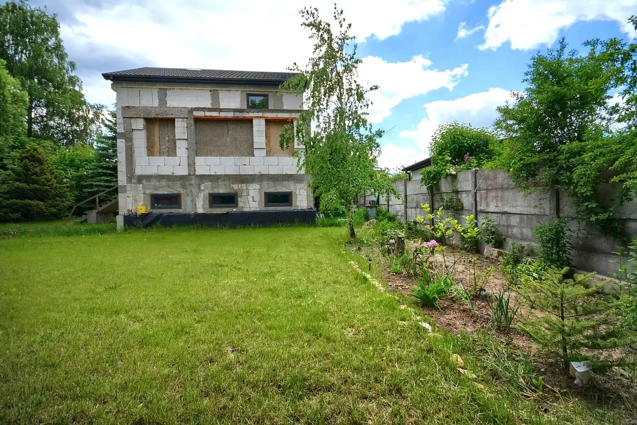 The building is in developer condition, with the basement level finished. Electrical and plumbing installations have been completed, as well as underfloor heating. The house was built based on an individual design using H+H blocks, covered with metal roofing tiles, and equipped with a dual-function gas boiler for heating. The house offers significant layout and design potential for the new owner.