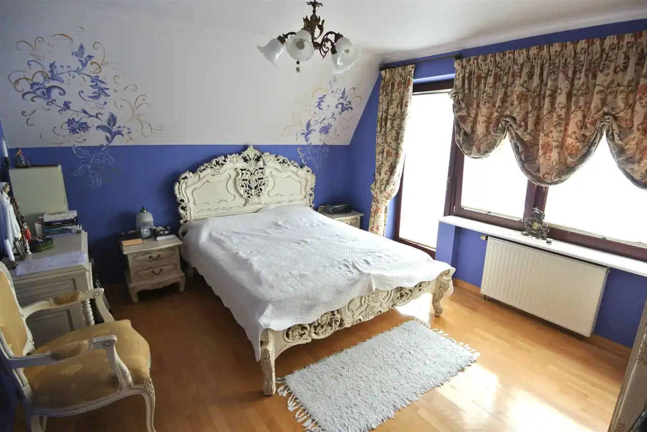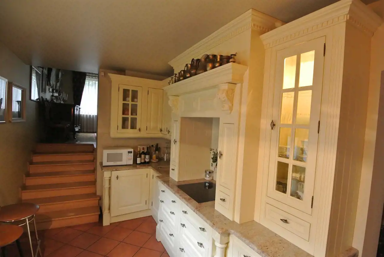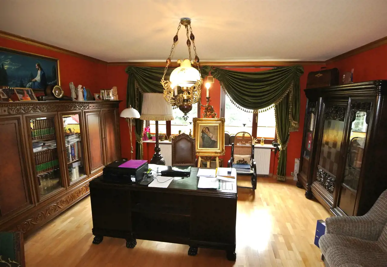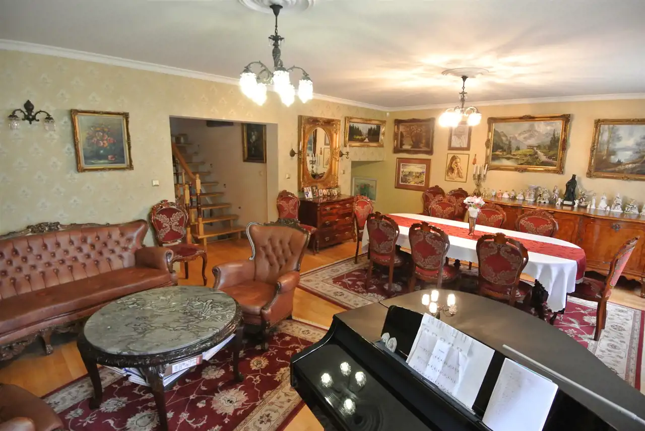 Możliwość zakupu z wyposażeniem widocznym na zdjęciach za dodatkową opłatą (wnętrze domu wykończone w klasycznym stylu, w pokojach znajdują się antyki oraz wysokiej jakości meble wykonane na zamówienie. Na ścianach płótna i obrazy oprawione w ramy, w salonie fortepian).