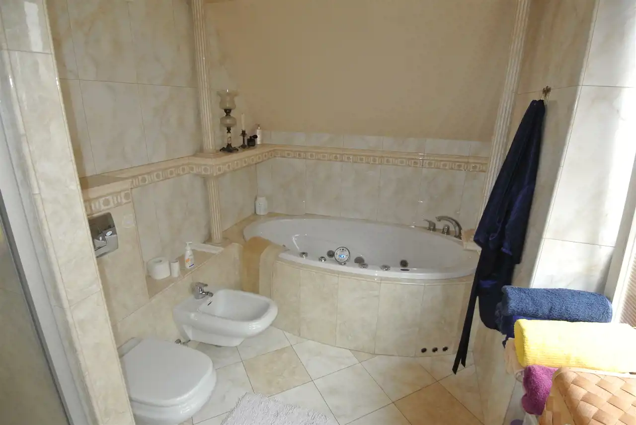 Kitchen with custom-made furniture, marble worktop, practically finished and fitted out. The bathroom is equipped with hydromassage, bathtub, shower and an electrically heated floor. Walls in some rooms are decorated with hand-painted motifs.