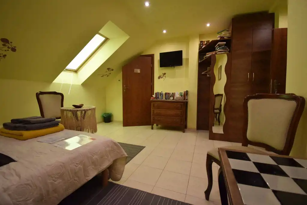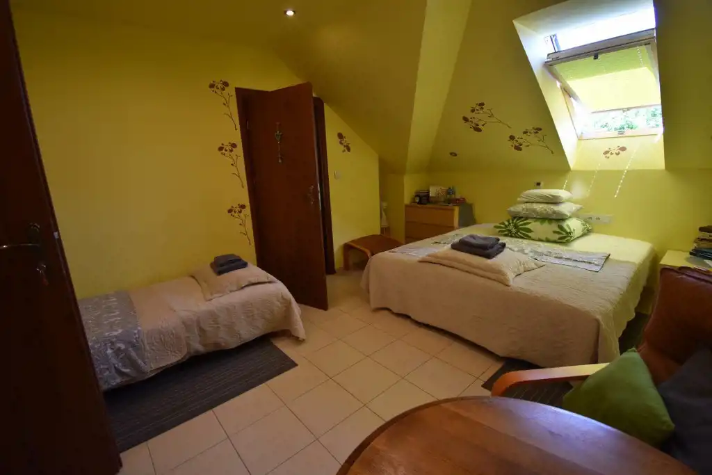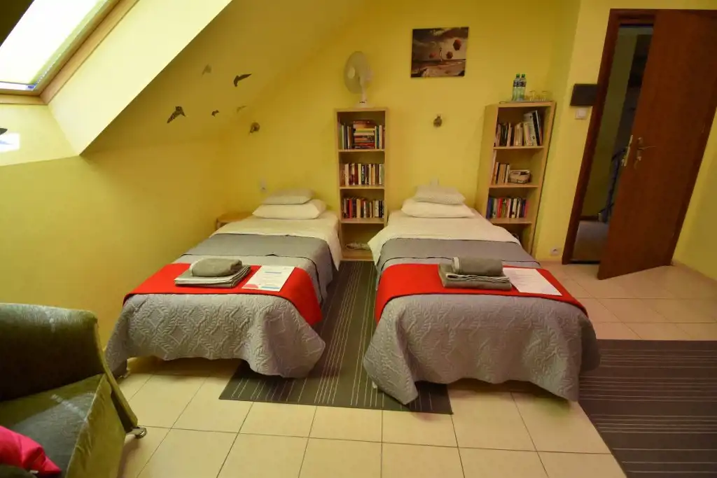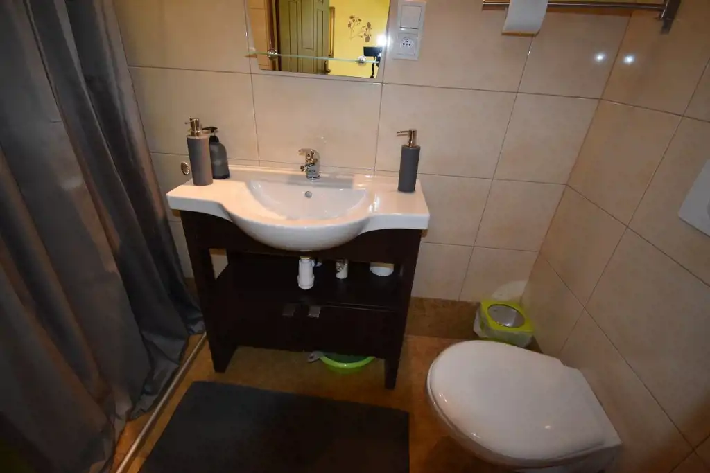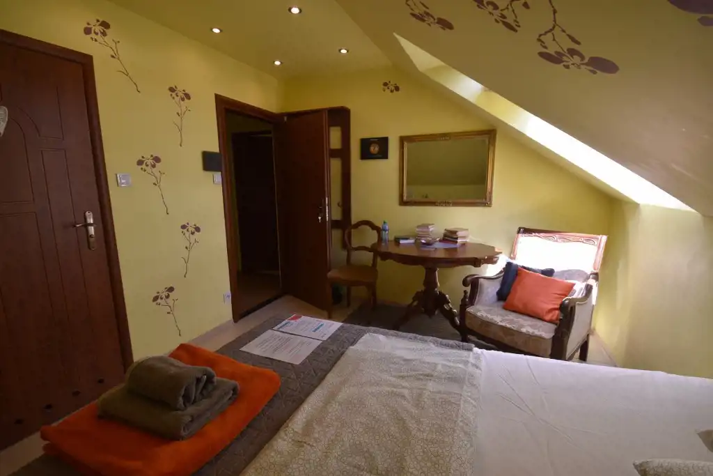 piętro: 6 pokoi gościnnych (1-, 2-, 4-osobowych, każdy pokój z łazienką), aneks kuchenny, hall;