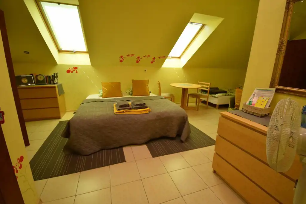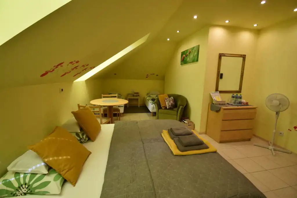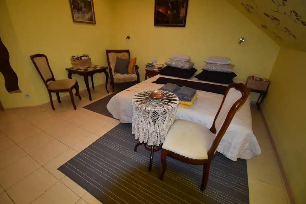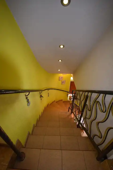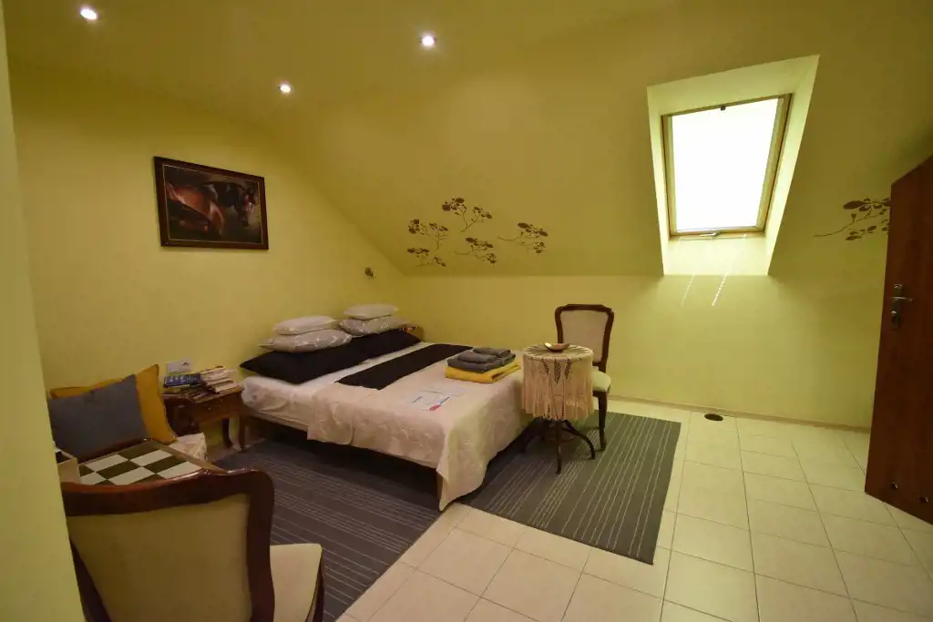 piętro: 6 pokoi gościnnych (1-, 2-, 4-osobowych, każdy pokój z łazienką), aneks kuchenny, hall;
