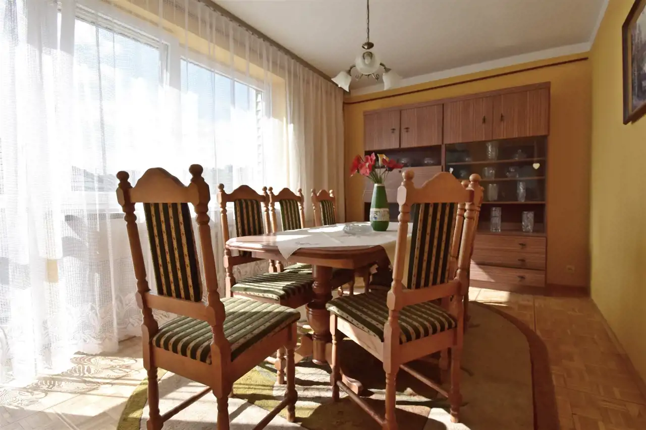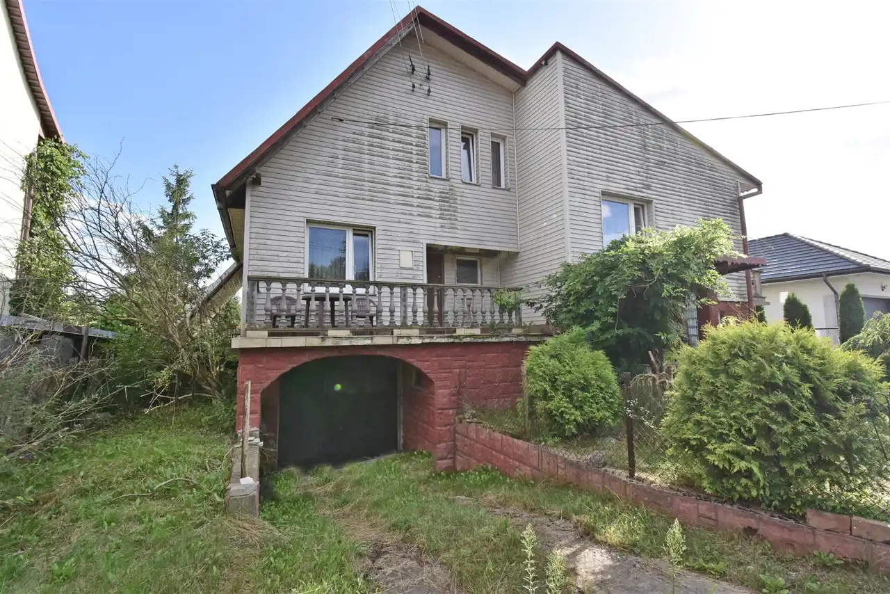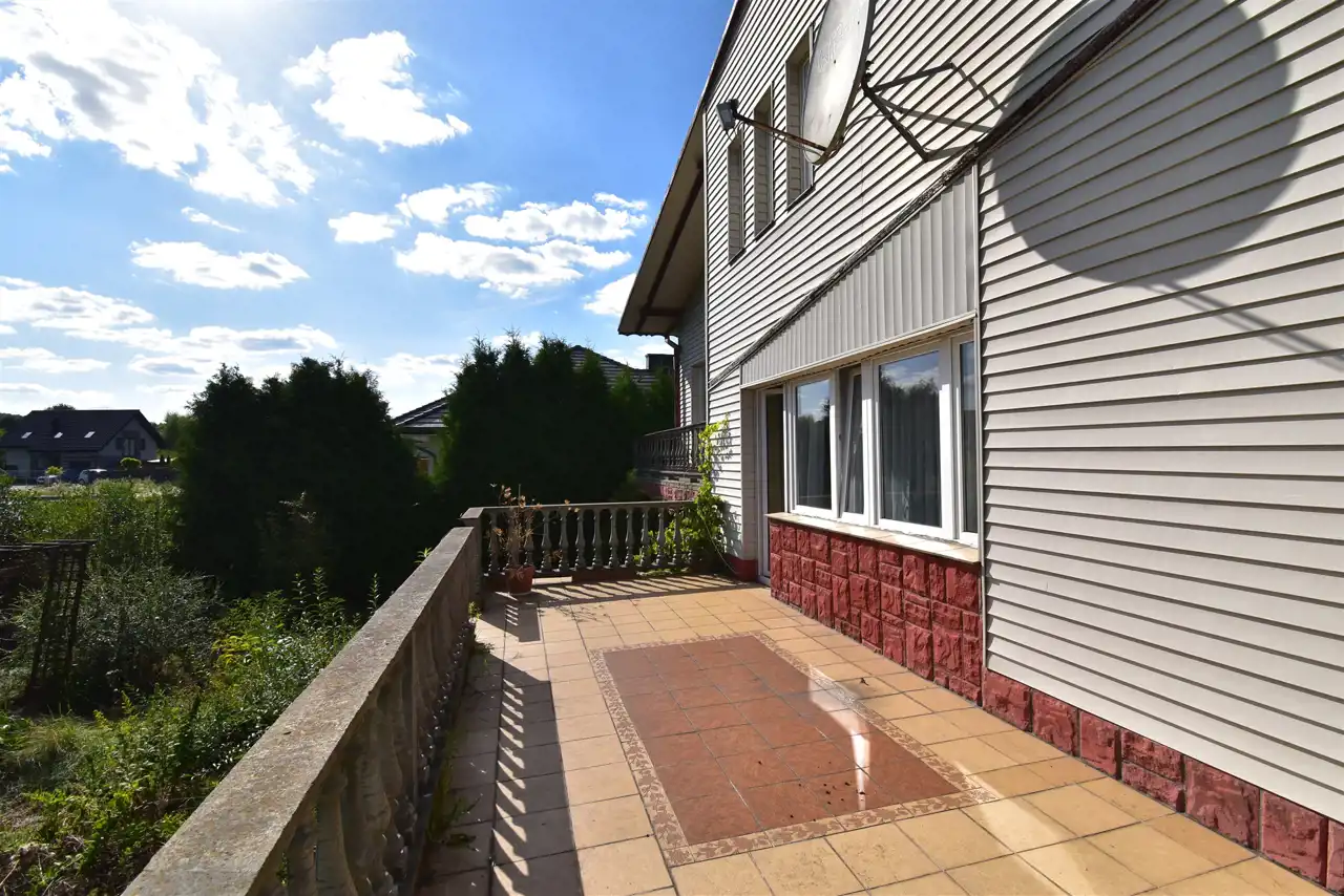 For sale: a detached eight-room house with a usable area of approx. 200 m2 (total area approx. 253 m2). The property is located in the Białogon district, on Janowska Street. The building sits on a plot of 677 m2. The plot is rectangular, with dimensions of approx. 18.41 m (frontage) x 38.13 m. The house was built in the 1980s.