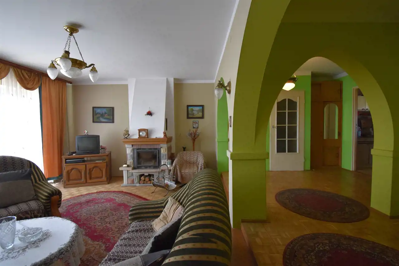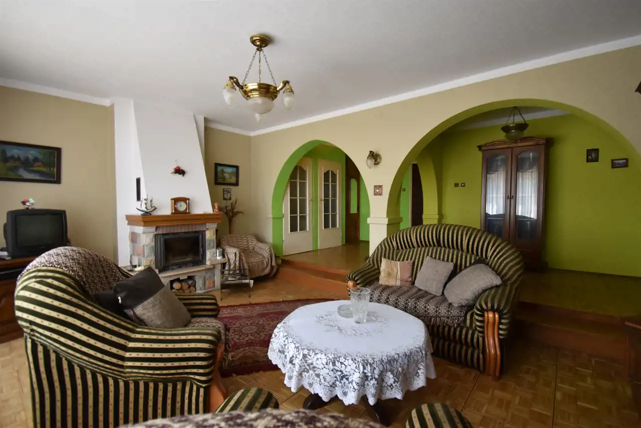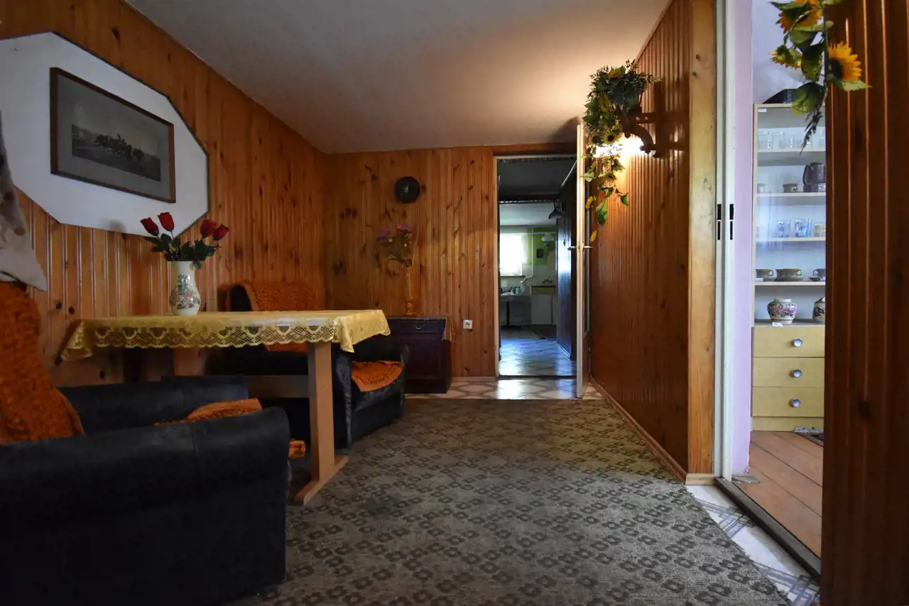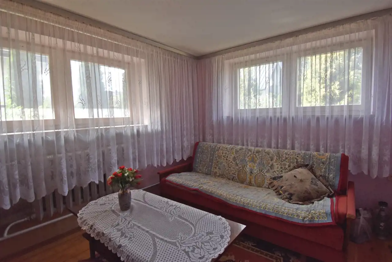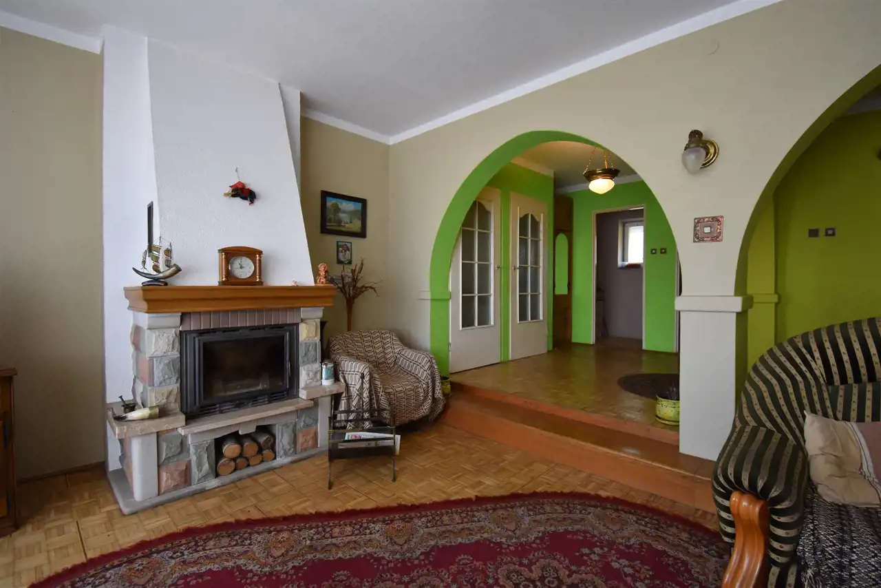 The roof is covered with asbestos sheets, the building is insulated. The property requires complete renovation. Windows are PVC and wooden. Parquet mosaic floors in rooms; tiles in kitchen and bathroom. Heating with a coal-fired furnace. Additionally, a fireplace without a water jacket is installed in the living room. Garage integrated into the building.