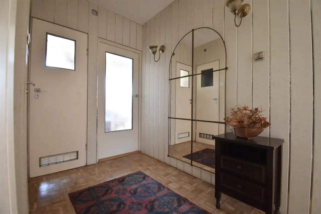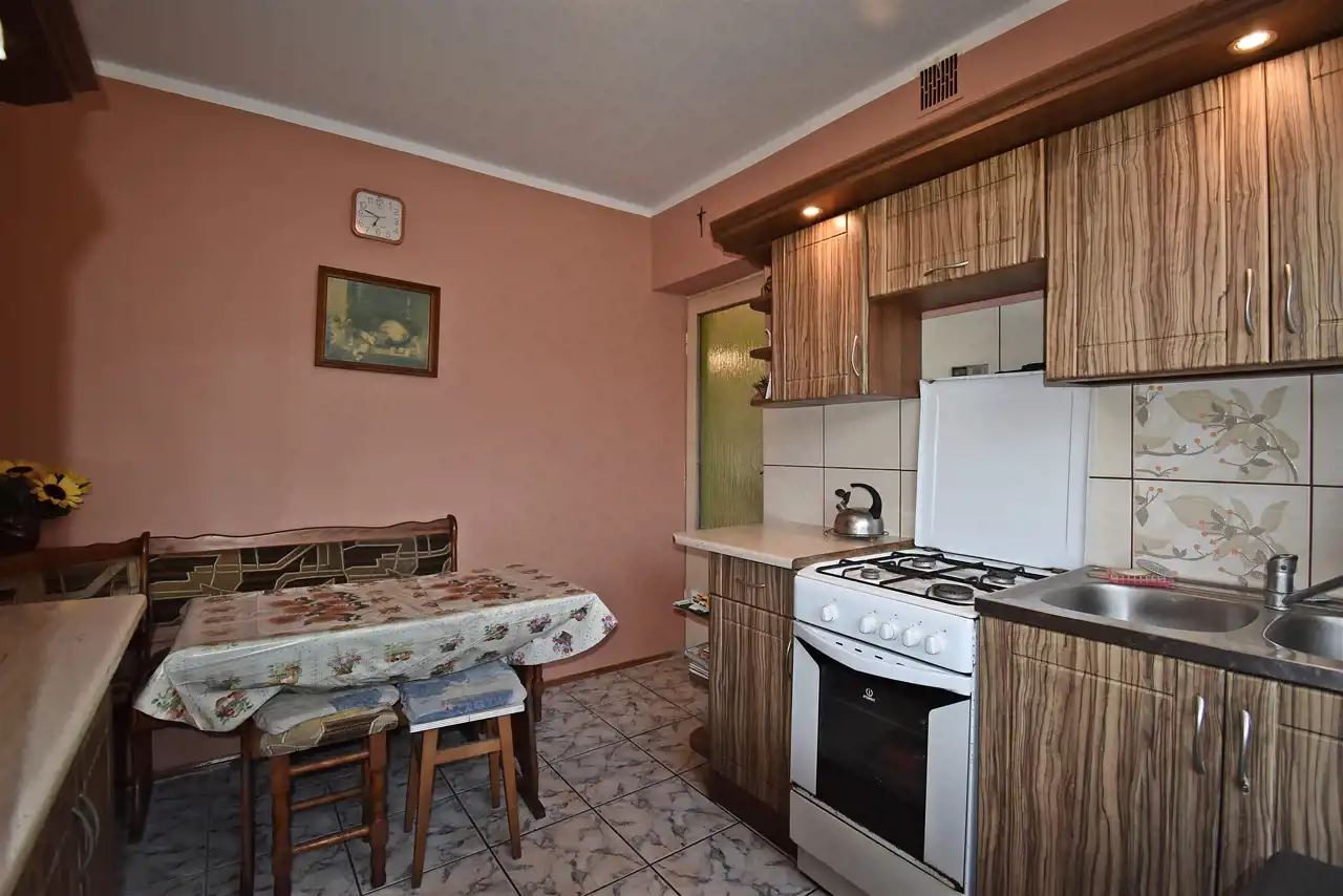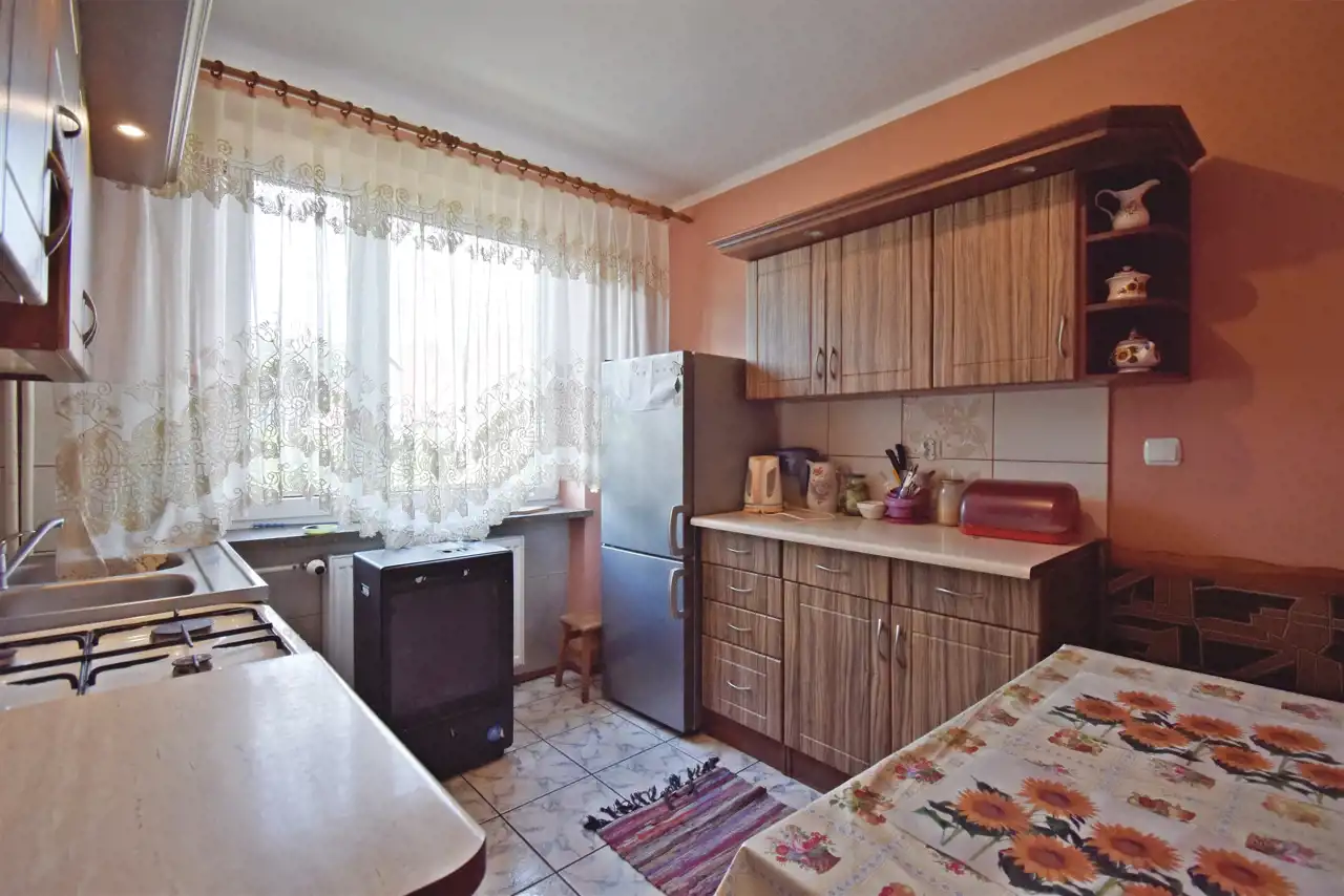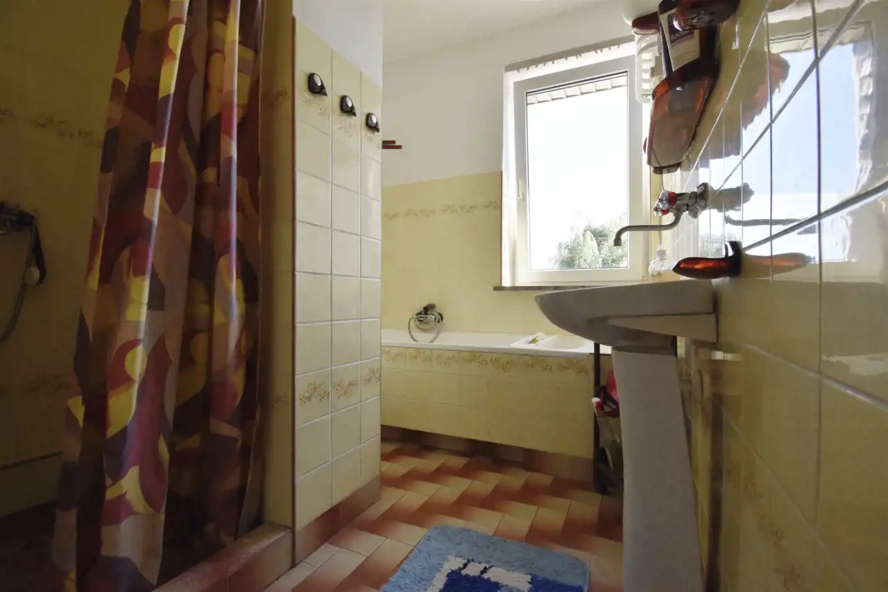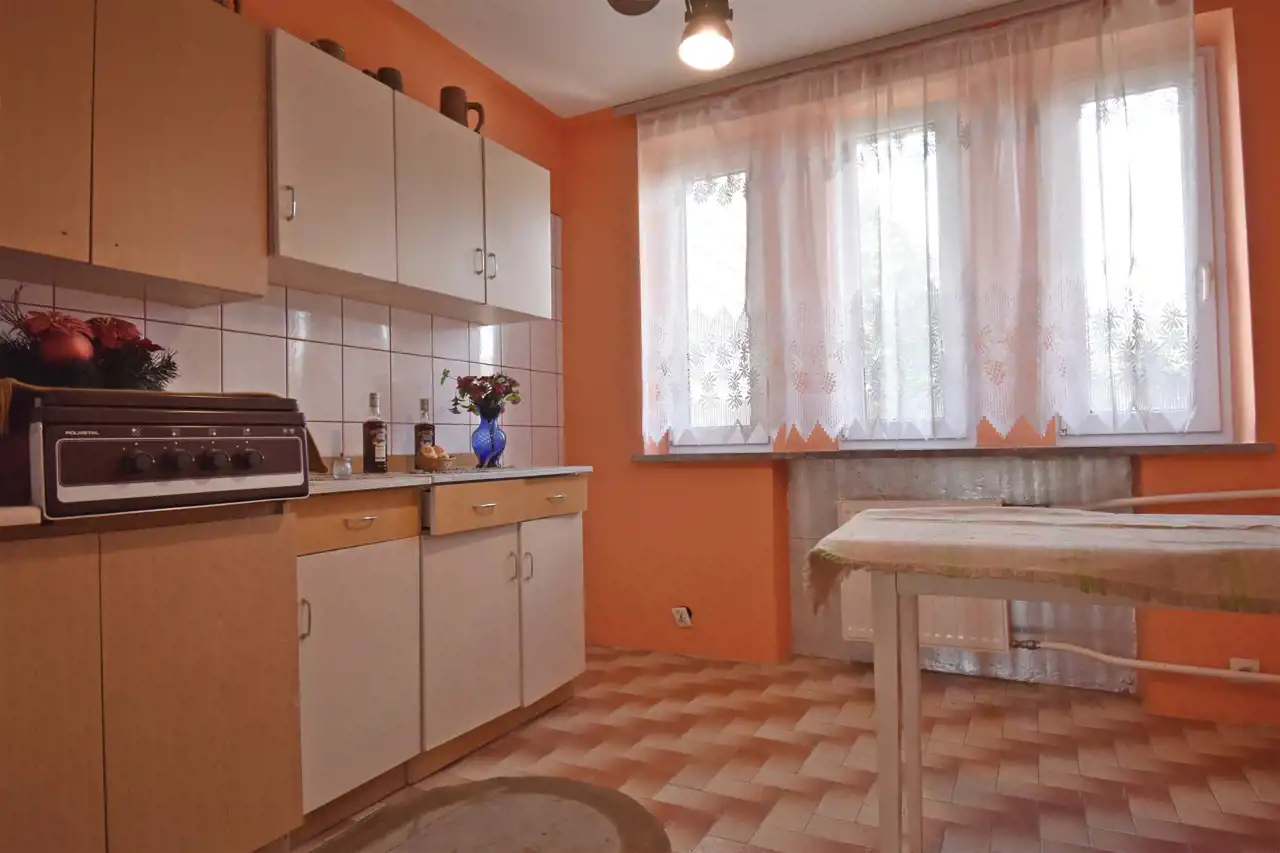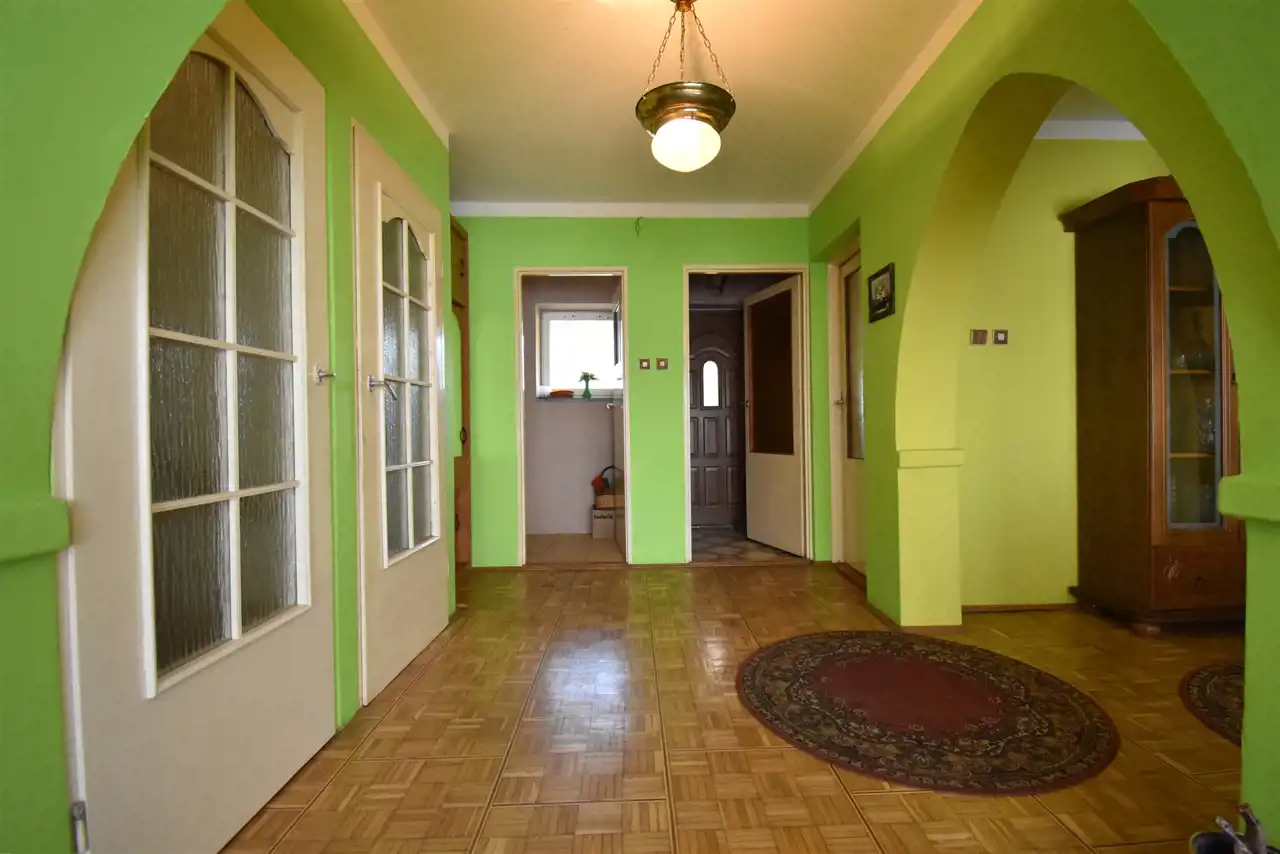 The roof is covered with asbestos sheets, the building is insulated. The property requires complete renovation. Windows are PVC and wooden. Parquet mosaic floors in rooms; tiles in kitchen and bathroom. Heating with a coal-fired furnace. Additionally, a fireplace without a water jacket is installed in the living room. Garage integrated into the building.