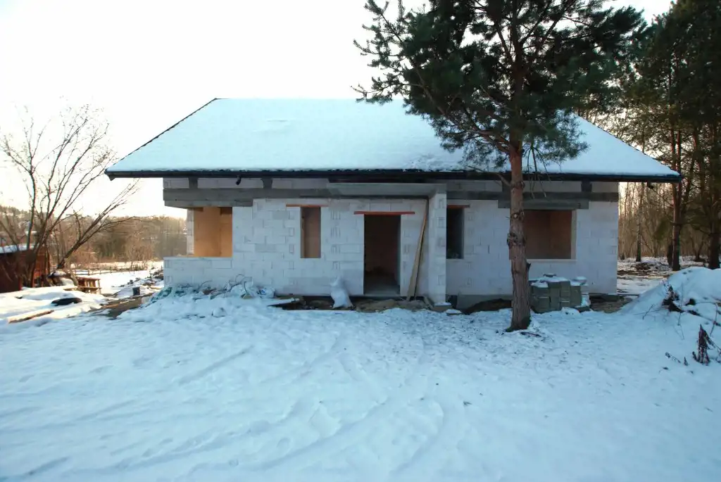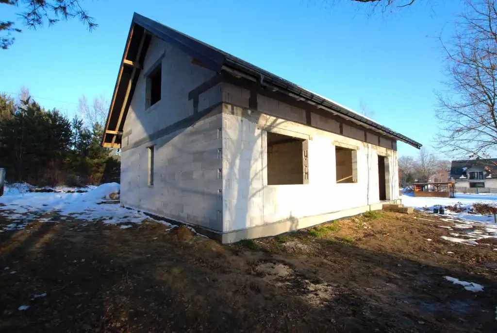 Dom sprzedawany w stanie surowym zamkniętym z wyprowadzoną instalacją elektryczną. Wybudowany z bloczków H+H, pokrycie dachu blachą. Planowany termin doprowadzenia wody i kanalizacji 2026 rok. Dojazd do domu drogą wewnętrzną (służebność).