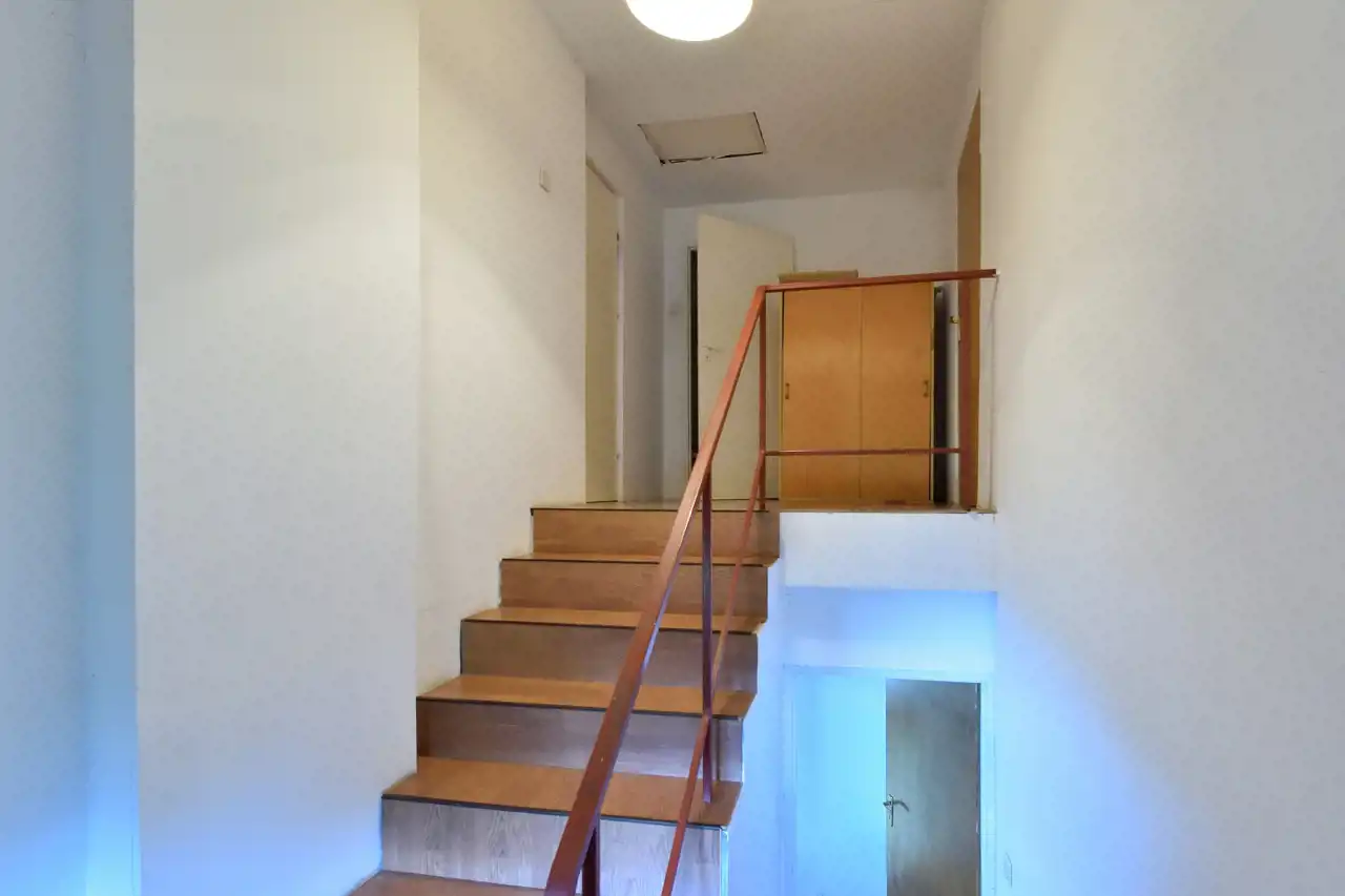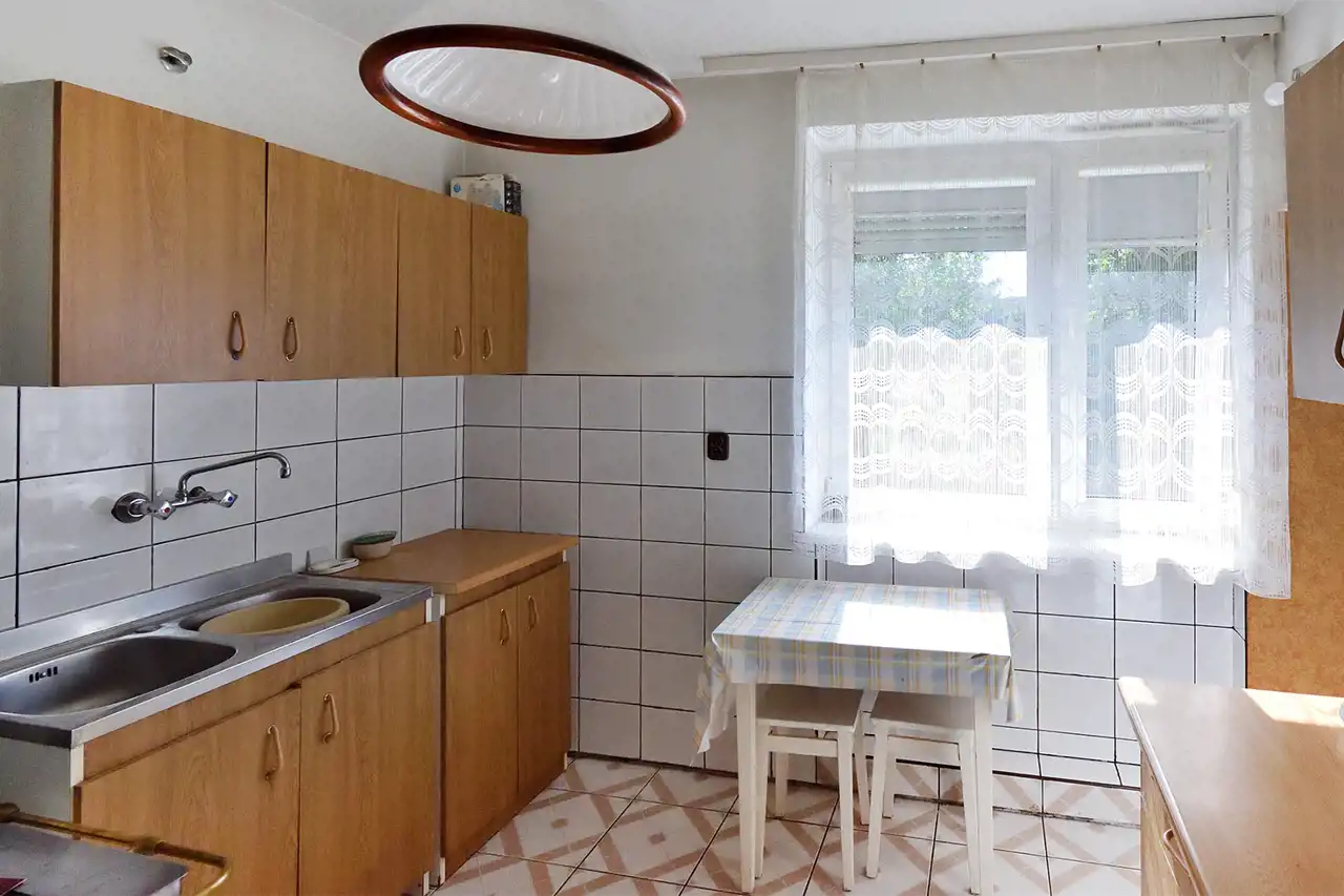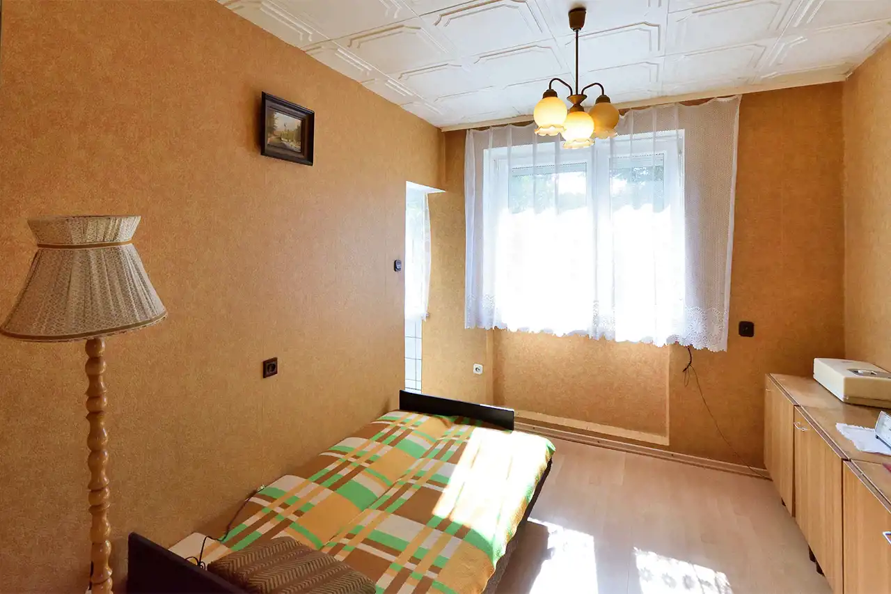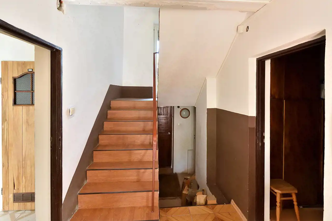 Na parterze: widna, oddzielna kuchnia, 3 pokoje, garderoba, łazienka i oddzielne WC, przedpokój i klatka schodowa. Na piętrze: kuchnia połączona z jadalnią, 3 pokoje, łazienka, WC. Z klatki schodowej na półpiętrze wyjście na balkon.