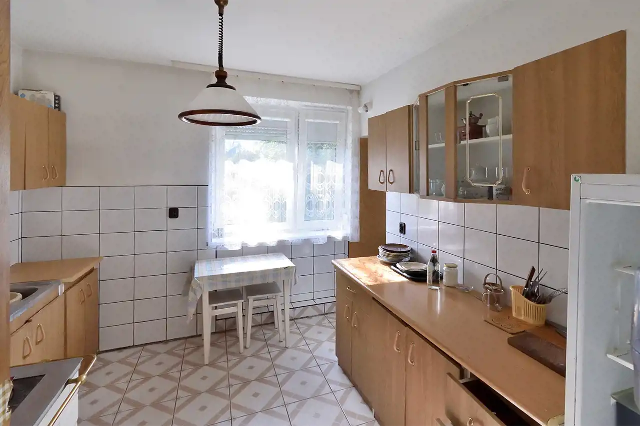 Do sprzedania dom, o pow. całkowitej 227,8 m2 (użytkowa 143,50 m2), zlokalizowany na działce o pow. 805 m2 na os. Bukówka w Kielcach. Budynek z cegły i pustaka, kryty eternitem, został oddany do użytku w 2002r. Okna PCV, na części założone rolety. Ogrzewanie kominkiem i elektryczne piecami akumulacyjnymi. Woda z sieci miejskiej, kanalizacja miejska w rogu działki, nie podłączona, obecnie używane jest szambo.