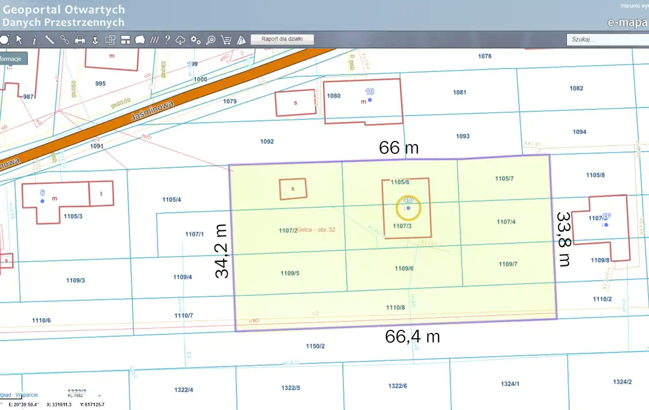 Wymiary działki: około 23,7 m x 34 m. Szerokość frontu ok. 23,7 m.