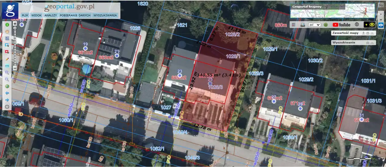 Wymiary działki ok.: 12,5 (szer. od frontu) x 26,5 x 11 x 27 [m].