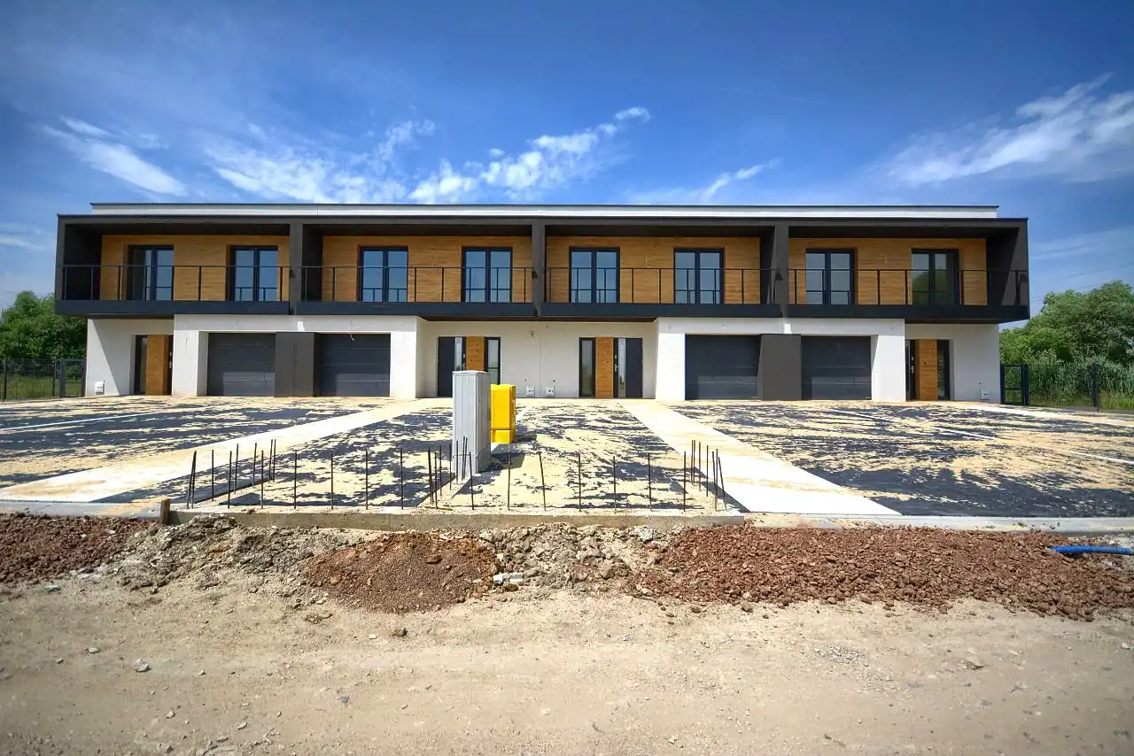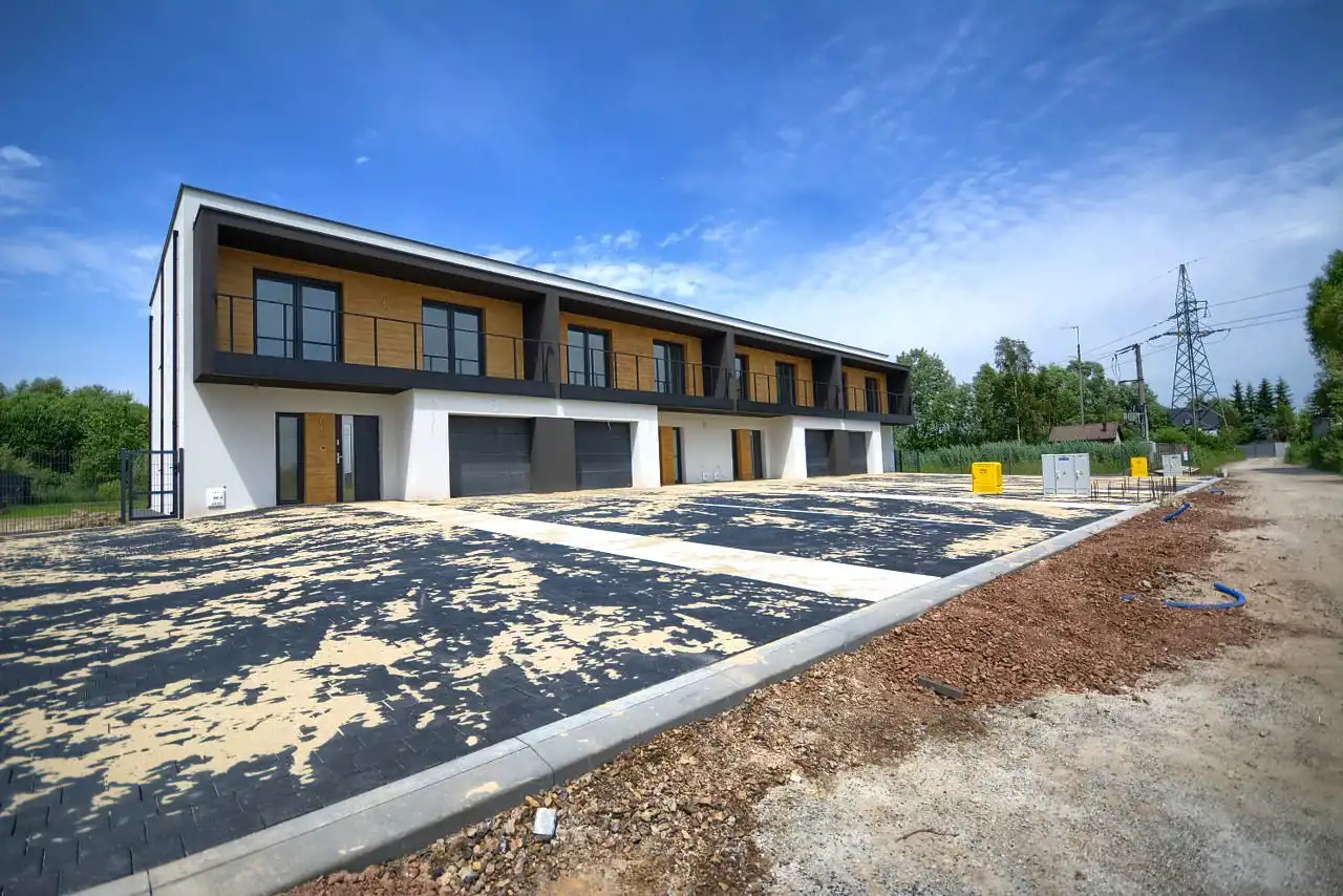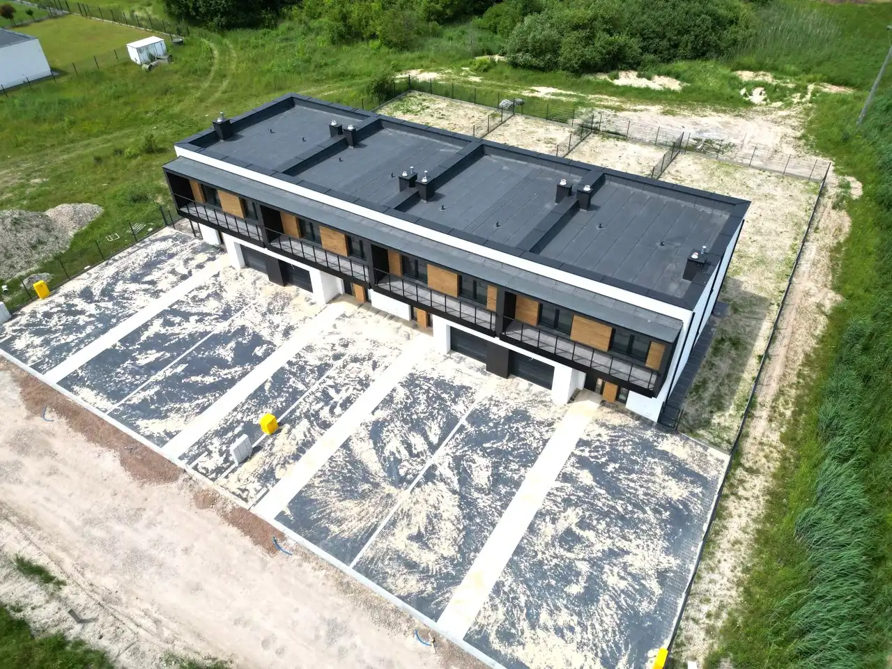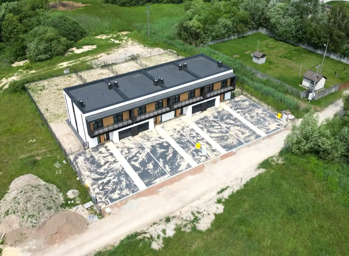 The plot has an area of 346 m². The house is in developer's condition, with heating provided by a dual-function gas boiler. The area around the building will be leveled, and the driveway to the garage and the path to the front door will be paved with cobblestones. The plot is partially fenced. The roof is flat with full thermal insulation. Parking is available in the garage (within the house structure) and in front of the building.