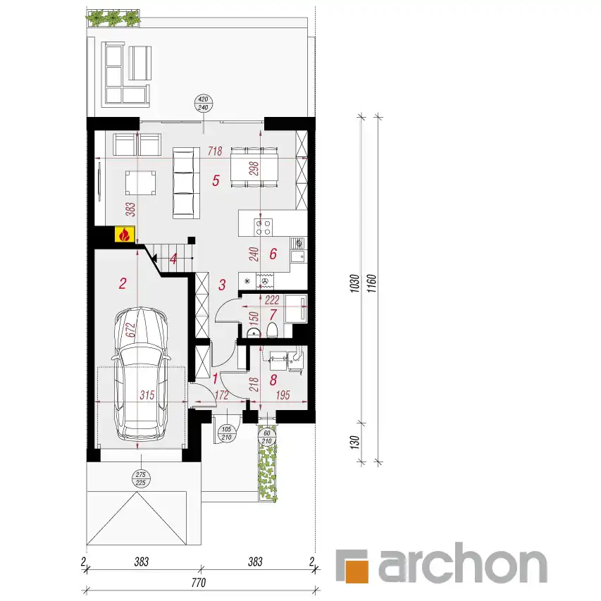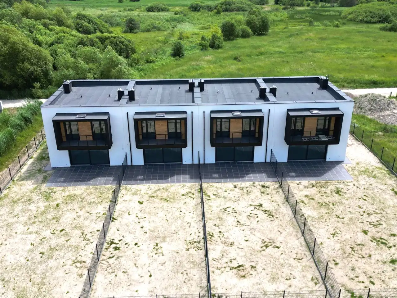Plot area: 534 m². The house is in a developer's condition, with heating provided by a dual-function gas boiler. The area around the building will be leveled, with the driveway to the garage and the pathway to the front door paved with cobblestones. The plot is partially fenced. The flat roof is fully thermally insulated. Parking is available in the garage (within the building) and in front of the house.