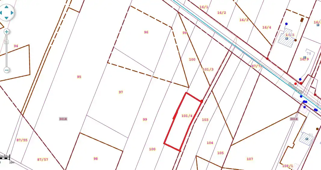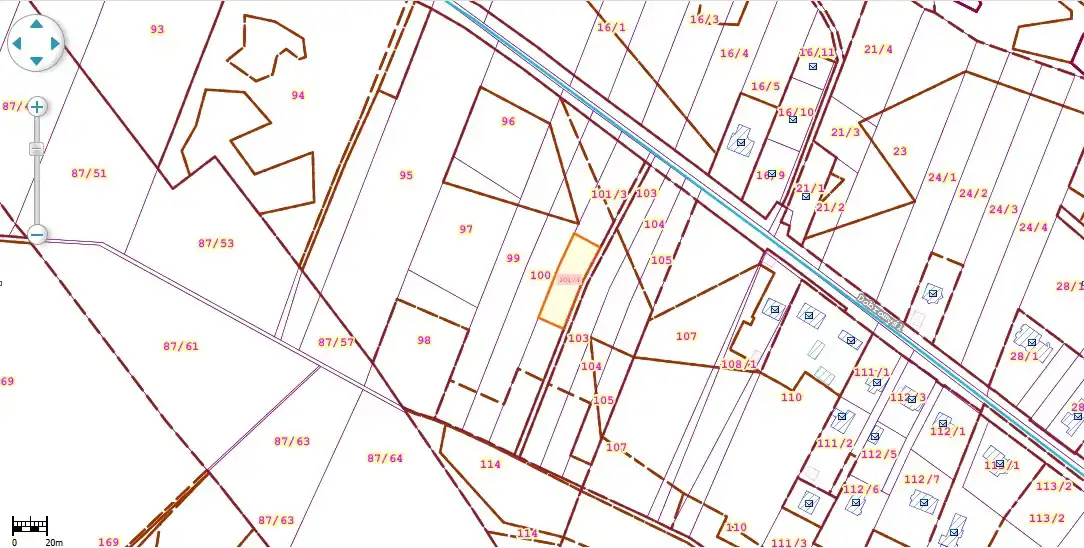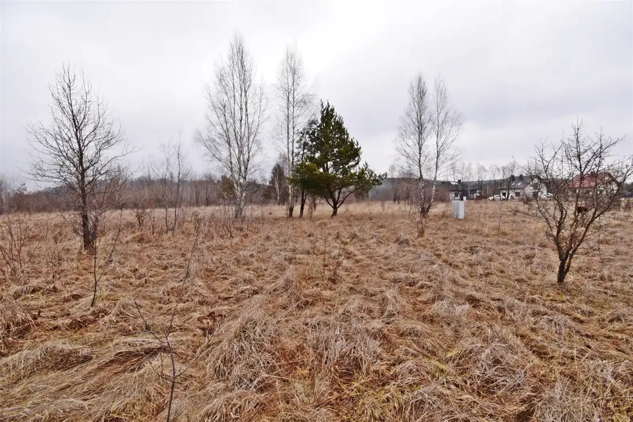 The plot is situated in an area with newly built single-family homes. It is flat, rectangular, undeveloped, and unfenced. Access is via a public asphalt road, followed by approximately 62 meters on an unpaved private road (about 3.5 meters wide). The location offers a peaceful, green environment near a forest, with quick access to the city center.
