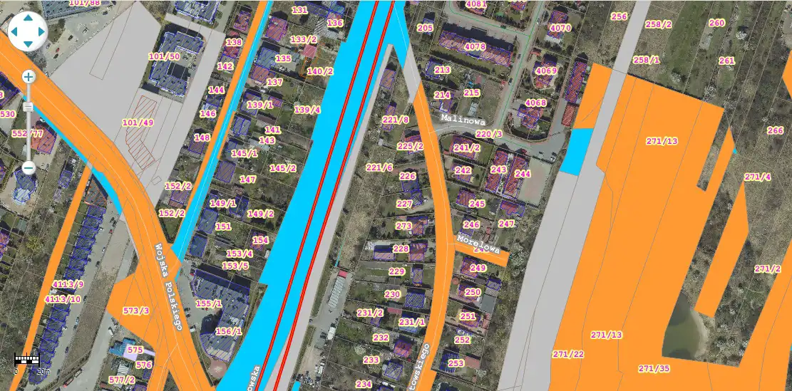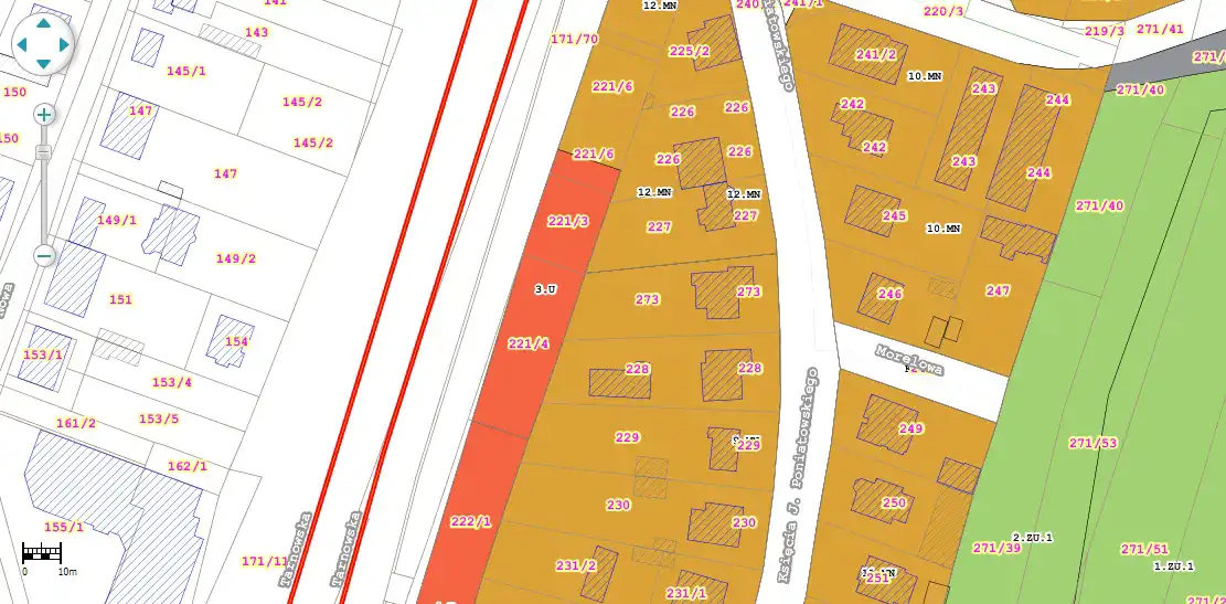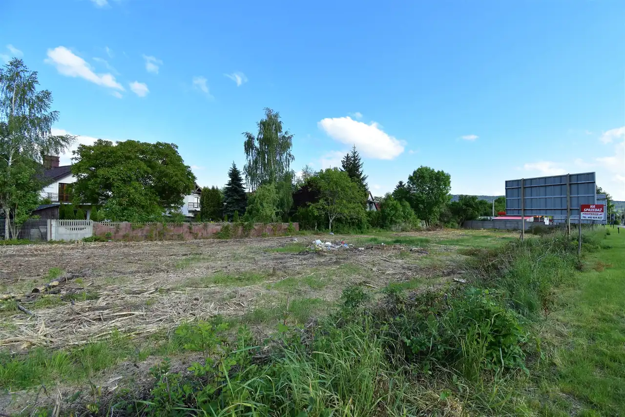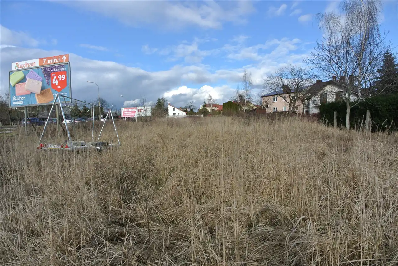 Brak ogrodzenia, działka częściowo zagospodarowana - konstrukcje banerów reklamowych. Obszar częściowo objęty Miejscowym Planem Zagospodarowania Przestrzennego - jako przeznaczenie U- zabudowa usługowa, MN - zabudowa zabudowa mieszkaniowa jednorodzinna.