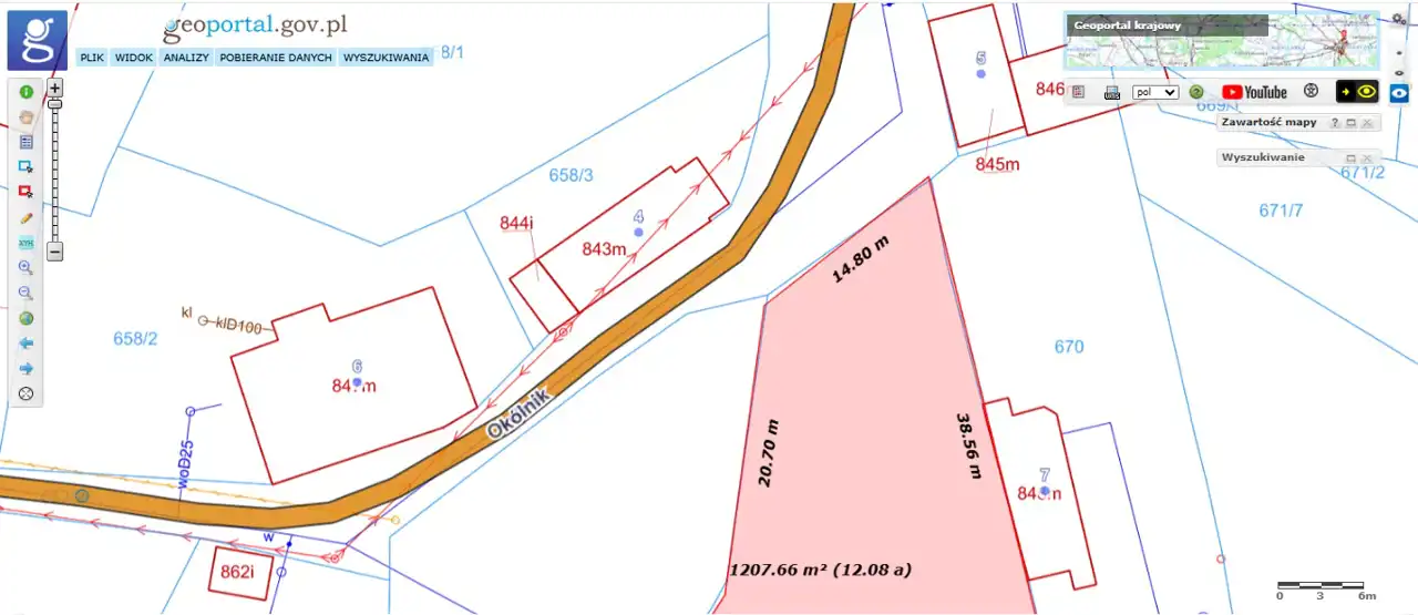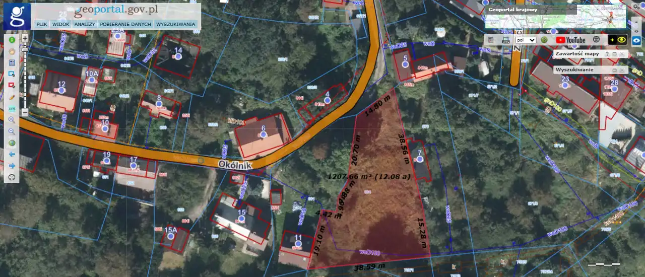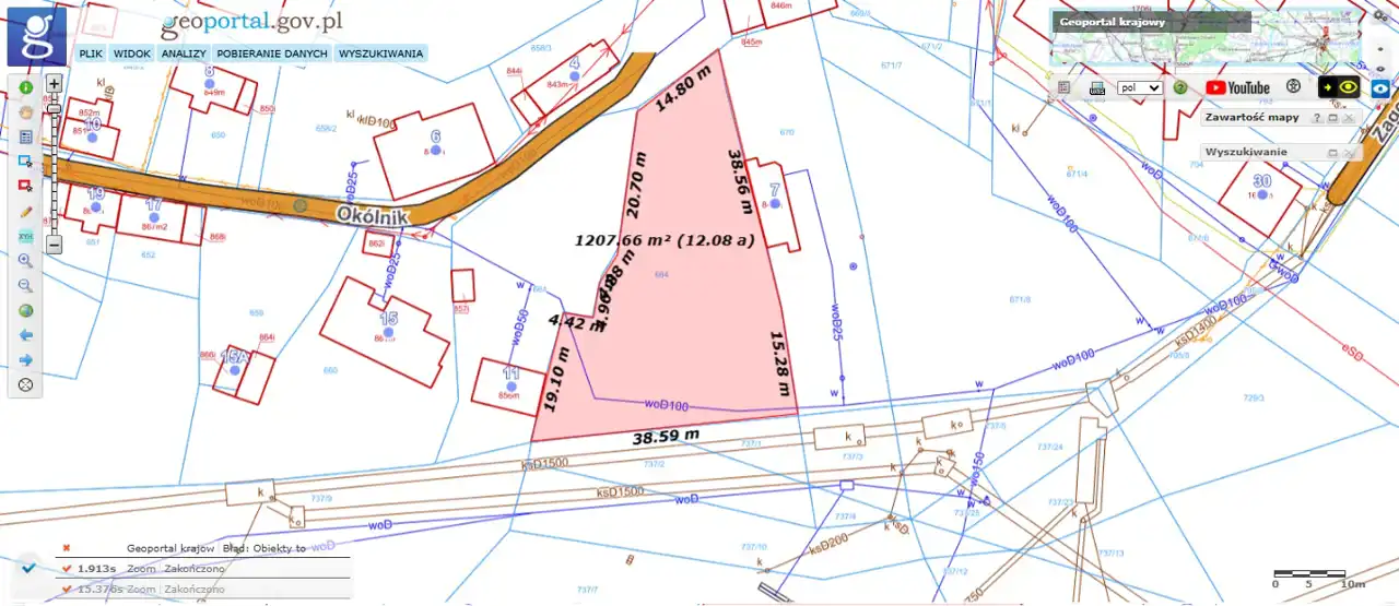 For sale: a plot of land with an area of 1214 m² located in the Pakosz district, on Okólnik Street. The plot is in the first line from the road, surrounded by single-family houses, close to a forest and the Biesak-Białogon nature reserve.