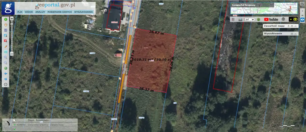 Przybliżone wymiary działki: 38 (szerokość od frontu) x 26 [m].