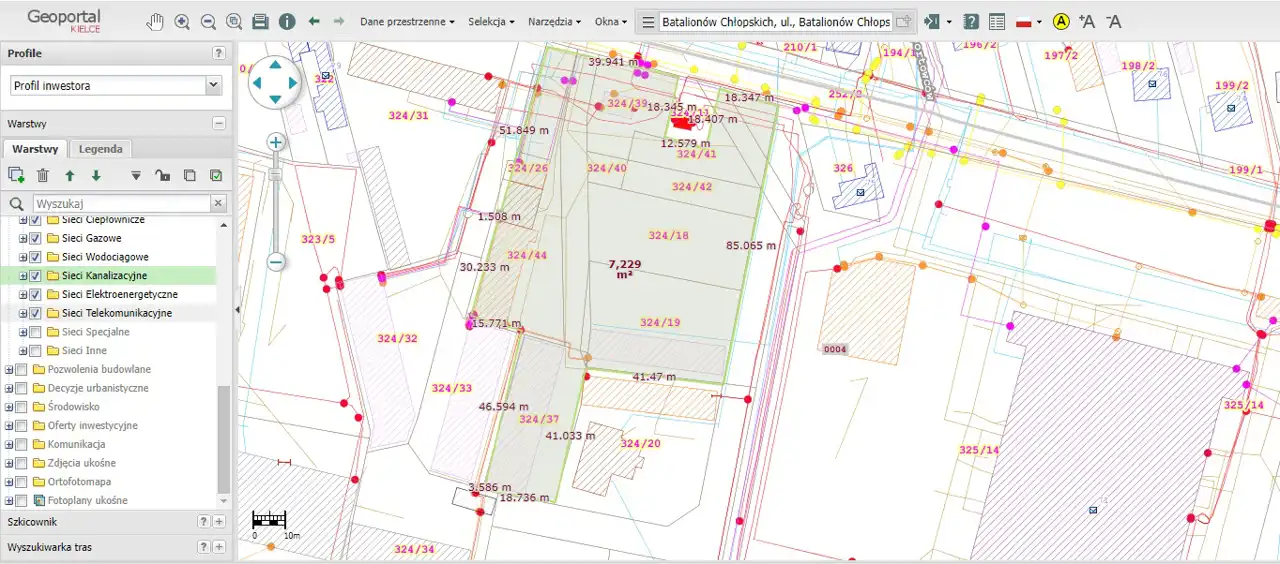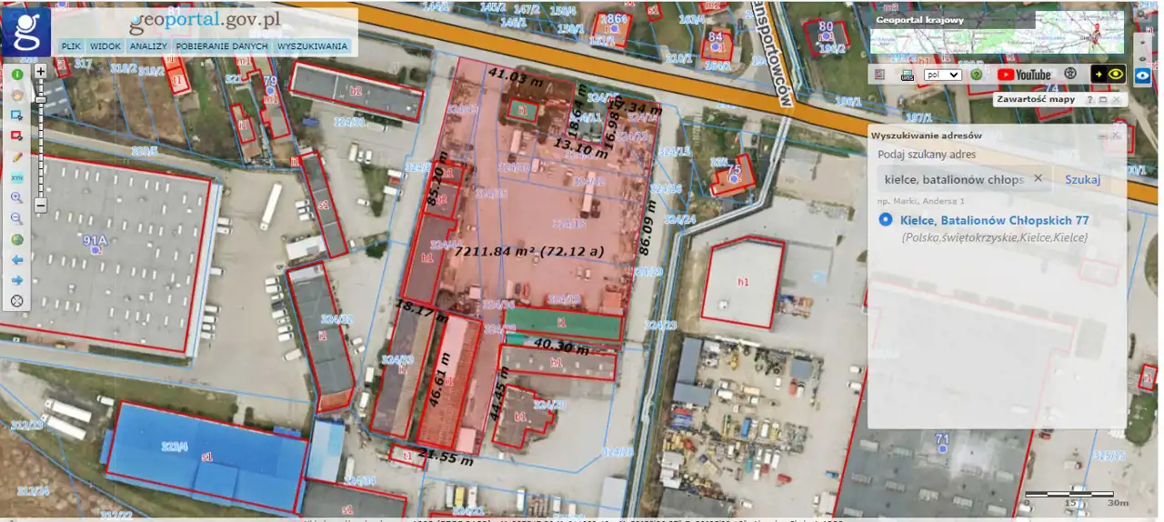 For sale: A property located on a corner plot of 7313 m² in an industrial-service area. The site is well connected to other parts of the city (public transport stops, S7 road junction).