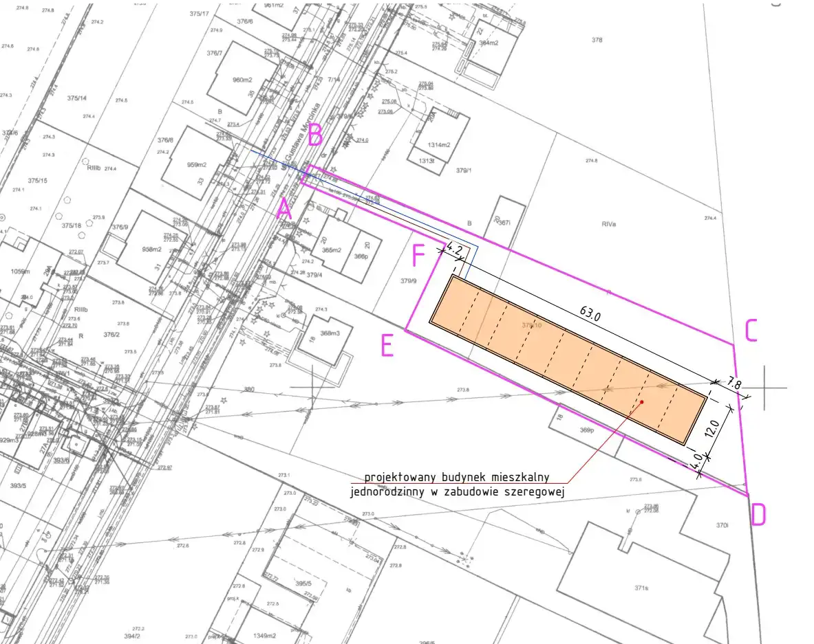 Dla działki są uzyskiwane warunki zabudowy na 9 domów w zabudowie szeregowej.