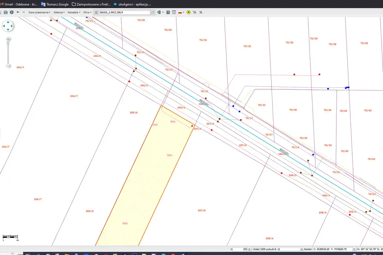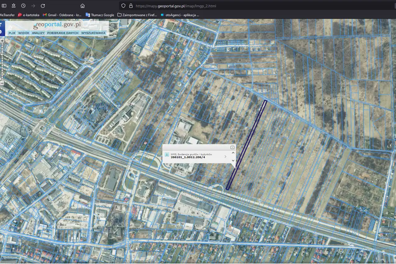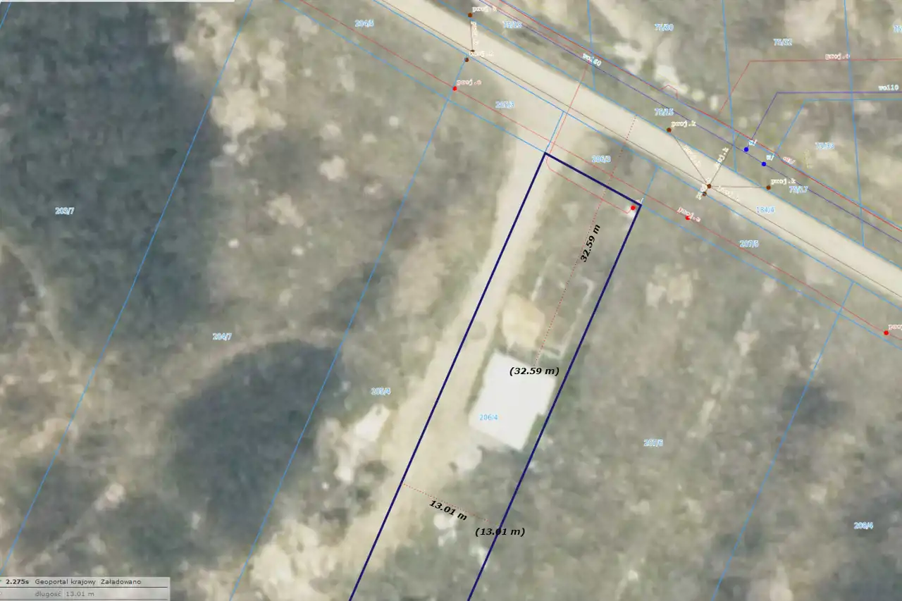 The rectangular-shaped plot has access to the road (currently a dirt road). The approximate dimensions of the plot are 13 x 107 x 13 x 107 [m]. The front width is 13m, and the length is approximately 107m (the plot is in the process of division). The area is not fenced.