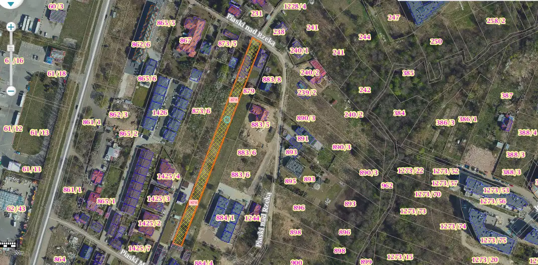 For sale: a plot of land with an area of 2,669 m², located in the Piaski district, on Piaski nad Rzeką Street. The property is rectangular in shape, measuring approximately 11 x 246 meters. Access is via a paved road. The plot is partially fenced and features a residential building designated for demolition. The land is situated close to recreational and green areas and is well connected to the city center.