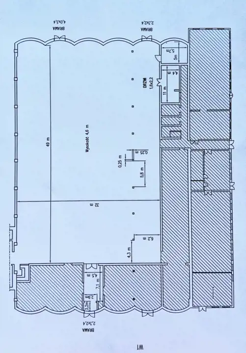 Hala posiada wysokość 4,5 m oraz dwie bramy wjazdowe o wymiarach 2,3 x 2,4 m oraz