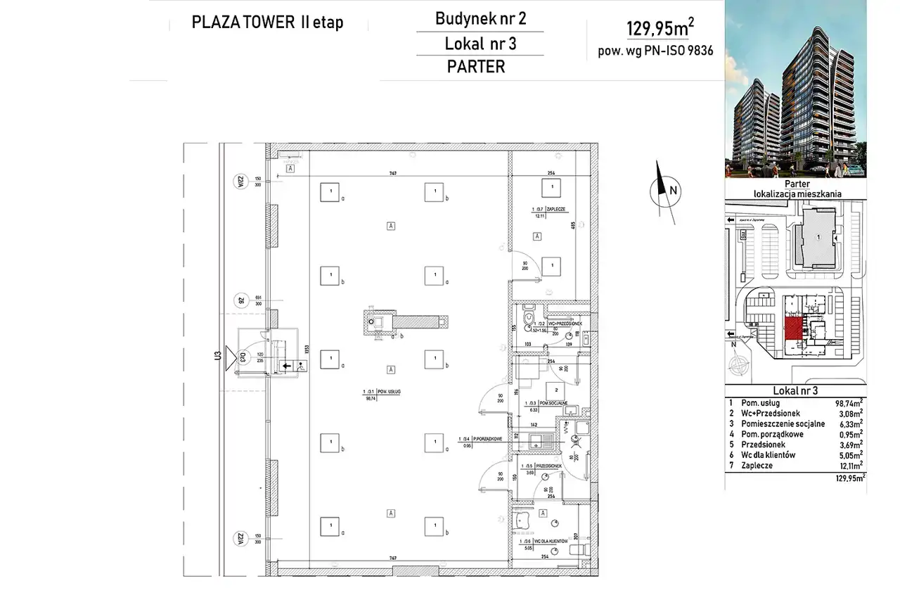 Do wynajęcia atrakcyjnie zlokalizowany lokal biurowy o pow. około 75 m2 usytuowany na parterze budynku w prestiżowej inwestycji Plaza Tower. Lokal nowocześnie wykończony, duże przeszklenia, w każdym pomieszczeniu klimatyzacja. Części wspólne - pomieszczenie socjalne, techniczne, dwie łazienki.