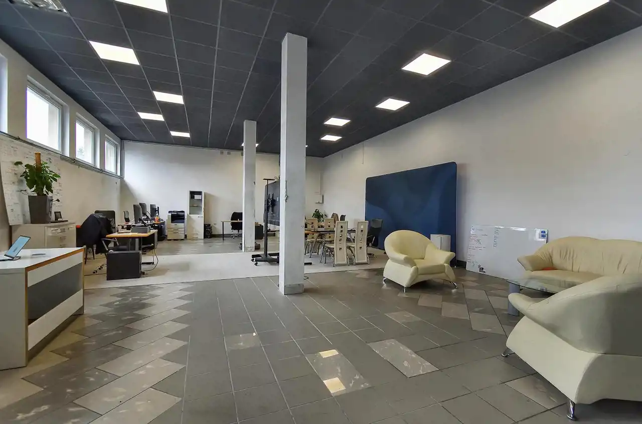 For rent: a commercial unit of approximately 195 m² intended for retail or service use, located in a single-story building on a fenced, concrete-paved lot in the eastern part of Kielce, near Cedzyna. The unit consists of a large sales area, a social room, and an office space (approx. 50 m²). The building is insulated and heated with a new pellet-based heating system with air blowers. The area is monitored.