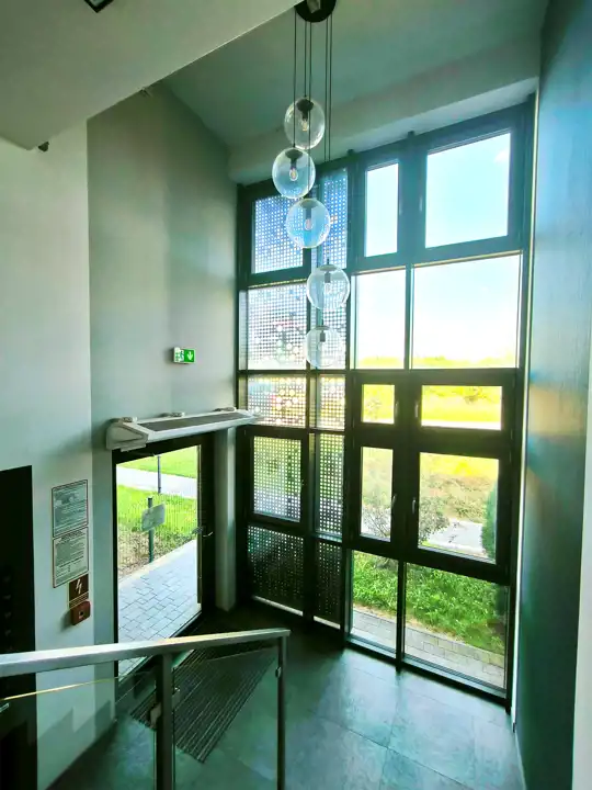 - nowoczesna bryła budynku z dużą ilością przeszkleń
