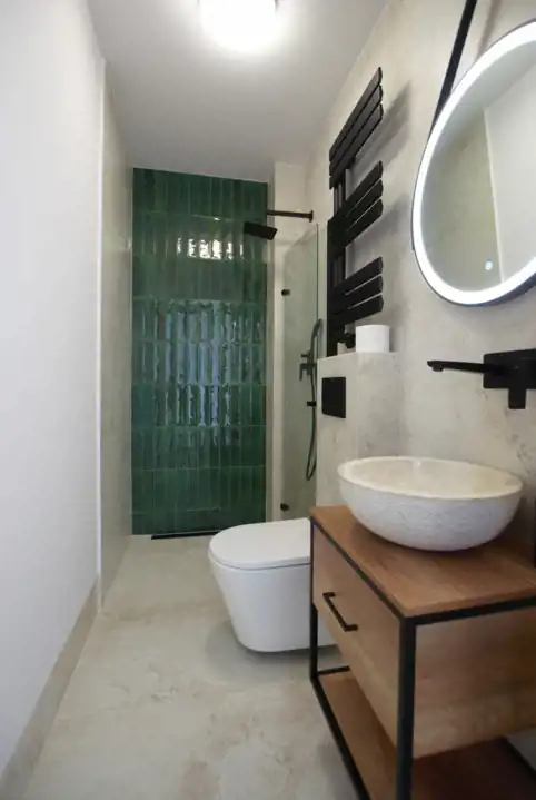 I piętro - 2 pokoje każdy z balkonem i własną łazienką. Głowna sypialnia z duzą garderobą.