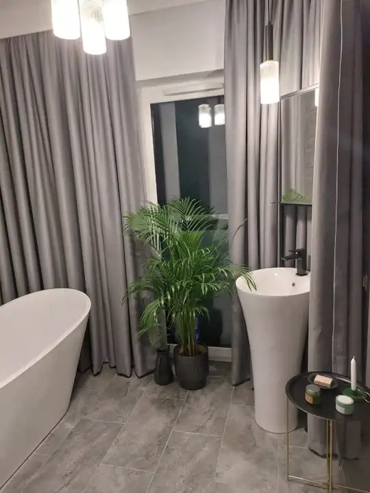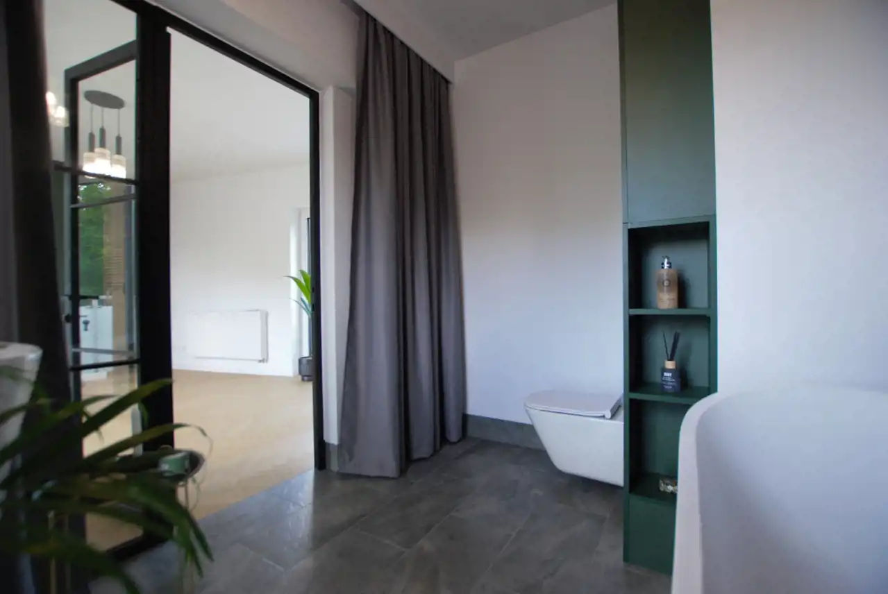 Segment w pełni wykończony w wysokim standardzie. Na podłogach w pokojach oraz salonie naturalny parkiet drewniany. W łazienkach wysokiej jakości płytki oraz armatura renomowanych producentów. Dom w pełni wyposażony w niezbędny sprzęt AGD (lodówka w zabudowie, zmywarka, pralko-szuszarka, okap) renomowanych producentów. Na pierwszym oraz drugim piętrze klimatyzacja.